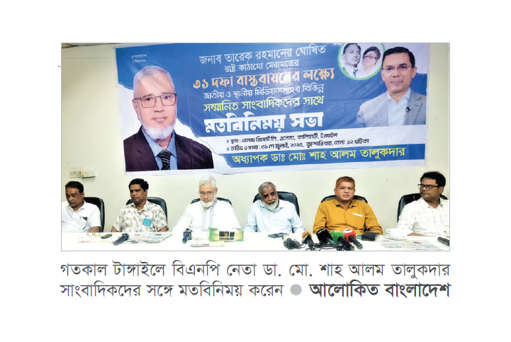 বিএনপির ভারপ্রাপ্ত চেয়ারম্যান তারেক রহমান ঘোষিত ৩১ দফার বাস্তবায়ন হলে দেশে কোনো বৈষম্য থাকবে না। বাংলাদেশ একটি সুখী ও সমৃদ্ধ রাষ্ট্রে পরিণত হবে। গতকাল বৃহস্পতিবার দ টাঙ্গাইলের উপ-শহর এলেঙ্গাস্থ বিরতি রিসোর্টের হলরুমে সাংবাদিকদের সঙ্গে মতবিনিময় সভায় বক্তারা ওই মন্তব্য করেছেন। ইংরেজি দৈনিক দ্যা ফিনান্সিয়াল টুডে’র নির্বাহী সম্পাদক শাহীন আব্দুল বারীর সভাপতিত্বে ড্যাবের উপদেষ্টা অধ্যাপক ডা. মো. শাহ আলম তালুকদারের উদ্যোগে ওই মতবিনিময় সভা অনুষ্ঠিত হয়। ওই মতবিনিময় সভায় দেশবরেণ্য সাংবাদিক সদ্য প্রয়াত সাইদুর রহমান রিমনের স্মরণে এক মিনিট নীরবতা পালন করা হয়। পরে অন্যান্যের মধ্যে বক্তব্য রাখেন- টাঙ্গাইল জেলা জাতীয় সাংবাদিক সংস্থার সাবেক সভাপতি ও যায়যায়দিনের স্টাফ রিপোর্টার মু. জোবায়েদ মল্লিক বুলবুল, সময় টিভির স্টাফ রিপোর্টার কাদির তালুকদার, সিনিয়র সাংবাদিক রশিদ আহমেদ আব্বাসী, দৈনিক আলোকিত বাংলাদেশের জেলা প্রতিনিধি ও কালিহাতী প্রেসক্লাবের সভাপতি রঞ্জন কৃষ্ণ পন্ডিত, জি টিভির সিনিয়র রিপোর্টার খন্দকার মহিউদ্দিন সুমন, চ্যানেল ২৪ এর জেলা প্রতিনিধি মাসুদ রানা, কালিহাতী প্রেসক্লাবের সাবেক সভাপতি মনিরুজ্জামান মতিন, দৈনিক যুগধারা পত্রিকার সম্পাদক হাবিবুর রহমান সরকার প্রমুখ। টাঙ্গাইল-৪ (কালিহাতী) আসনে বিএনপির মনোনয়ন প্রত্যাশি ডক্টরস অ্যাসোসিয়েশন অব বাংলাদেশের (ড্যাব) উপদেষ্টা অধ্যাপক ডা. মো. শাহ আলম তালুকদার বলেন, বিএনপির ৩১ দফা বাস্তবানের পাশাপাশি রাজনীতিকদের বক্তব্য ও কথাবার্তায় শিষ্টাচার ফিরিয়ে আনতে হবে। আমি আগামি দিনে কালিহাতী-টাঙ্গাইলের সাংবাদিক ও তাদের পরিবার-পরিজনের চিকিৎসায় সাধ্য অনুযায়ী সহযোগিতা করব। রাজনীতির গতানুগতিক ধারার বাইরে গিয়েও আমি কালিহাতী উপজেলার নানাবিধ উন্নয়নে কাজ করব। কালিহাতী ১৩টি ইউনিয়ন ও দুটি পৌরসভার একটি বড় উপজেলা। এলেঙ্গায় একটি নতুন প্রশাসনিক উপজেলার দাবি দীর্ঘ দিনের। আমি আগামি দিনে কালিহাতী উপজেলা ভেঙে এলেঙ্গাকে প্রশাসনিক উপজেলায় রূপান্তর করব। তিনি বলেন, বিএনপির ভারপ্রাপ্ত চেয়ারম্যান তারেক রহমানের ঘোষিত রাষ্ট্র কাঠামো মেরামতের ৩১ দফা নিয়ে তৃণমূল পর্যায়ে পৌঁছে দেওয়ার জন্য নিয়মিত কাজ করে যাচ্ছি। জনগনই দেশের মালিক। তাই দ্রুত অবাধ, সুষ্ঠু, শান্তিপূর্ণ ও গ্রহণযোগ্য নির্বাচন হওয়া উচিত।