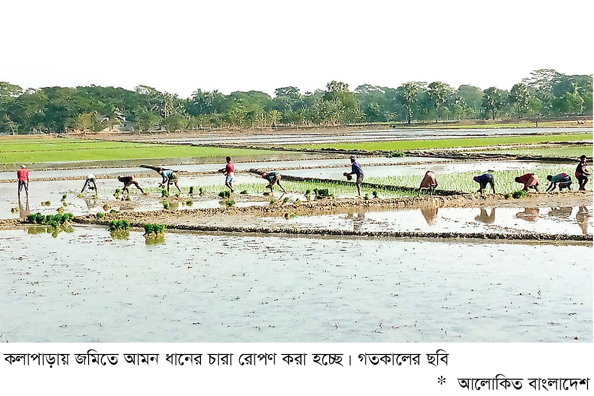কলাপাড়ায় আমন ধানের চারা রোপণে ব্যস্ত কৃষক