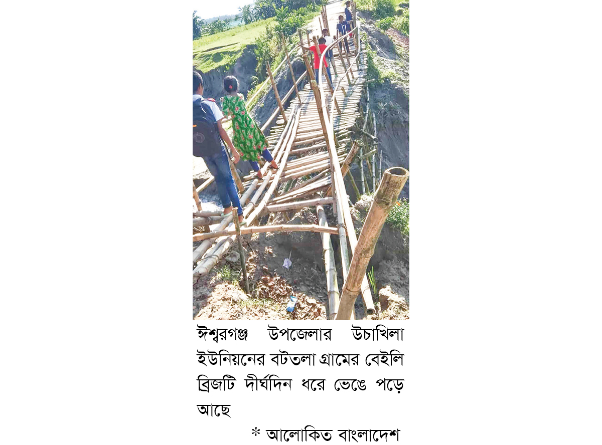 ময়মনসিংহের ঈশ্বরগঞ্জ উপজেলার উচাখিলা ইউনিয়নের বটতলা গ্রামে অবস্থিত বেইলি ব্রিজটি দীর্ঘদিন ধরে ভেঙে পড়ে আছে। এক বছরেরও বেশি সময় পার হলেও স্থায়ী কোনো ব্যবস্থা না নেওয়ায় চর-আলগী, আতকাপাড়া, পূর্বপাড়া, মরিচারচর, টান মলামারী, শান্তিনগরসহ ১৪টি গ্রামের কয়েক হাজার মানুষ কার্যত অবরুদ্ধ অবস্থায় দিন কাটাচ্ছেন।