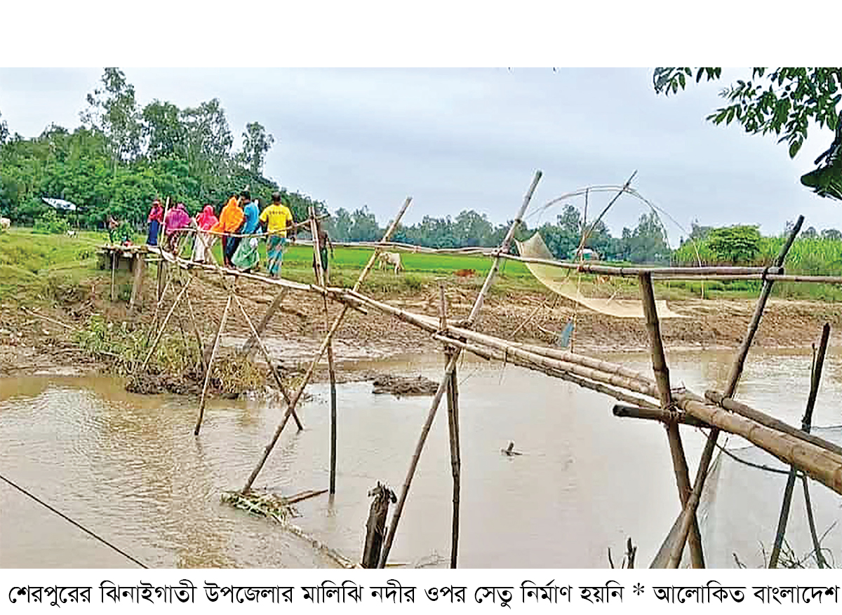 স্বাধীনতার ৫৪ বছর পরও শেরপুরের ঝিনাইগাতী উপজেলার হাতীবান্দা ইউনিয়নের মালিঝি নদীর ওপর স্থায়ী সেতু হয়নি। ফলে নদীর দুই তীরে থাকা অন্তত ৯টি গ্রামের কয়েক হাজার মানুষ আজও যোগাযোগ বিচ্ছিন্ন জীবন-যাপন করছে। ভরসা কেবল একটি বাঁশের সাঁকো, যা প্রতি বছর পাহাড়ি ঢলে ভেঙে যায়। এতে ভোগান্তি চরমে পৌঁছেছে স্থানীয়দের।