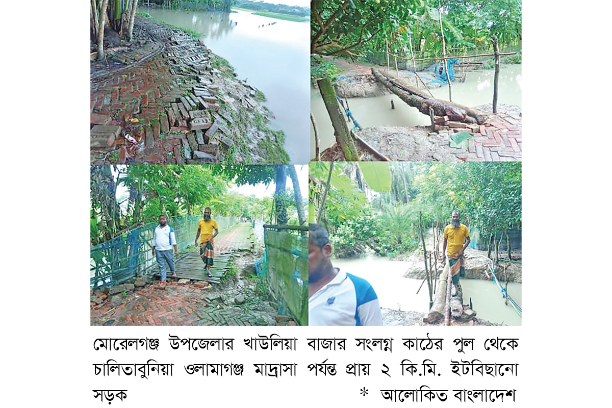 দক্ষিণ-পশ্চিমাঞ্চলের বিশ্বের সর্ববৃহৎ ম্যানগ্রোভ বনাঞ্চল মৎস্যভান্ডার নামে খ্যাত বিশ্ব ঐতিহ্য সুন্দরবনের উপকূলের বাগেরহাটে মোরেলগঞ্জ উপজেলার ১৬ নম্বর খাউলিয়া ইউনিয়নের ১ নম্বর ওয়ার্ডের খাউলিয়া বাজার সংলগ্ন কাঠের পুল থেকে চালিতাবুনিয়া ওলামাগঞ্জ মাদ্রাসা পর্যন্ত প্রায় ২ কি.মি. ইটের সোলিং রাস্তাটি এখন মরণ ফাঁদ বর্তমানে চলাচলের একেবারেই অনুপযোগী হয়ে পড়েছে। দীর্ঘদিন ধরে জনবহুল এই রাস্তাটি মেরামত বা সংস্কার না করায় তা ভেঙেচুরে এখন চলাচলের অযোগ্য হয়ে পড়েছে। অতিদ্রুত ইটের সলিং এই রাস্তাটি মেরামত বা সংস্কার করার জন্য ঊর্ধ্বতন কর্মকর্তাদের হস্তক্ষেপ কামনা করেছেন এলাকাবাসী। বিস্তীর্ণ অঞ্চলের যাতায়াতের প্রধান মাধ্যম জনগুরুত্বপূর্ণ রাস্তার বিভিন্ন জায়গায় ইট উঠে বড় বড় খাদের সৃষ্টি হয়েছে। চলাচলের সুবিধার্থে স্থানীয়রা কোথাও কোথাও ইট বিছিয়ে উপযোগী করলেও দীর্ঘদিন সংষ্কারের অভাবে সম্প্রসারিত গর্তগুলো পরিণত হয়েছে একেকটি মরণ ফাঁদে। এমন পরিস্থিতিতে আসন্ন বর্ষা মৌসুমকে ঘিরে নানা আশঙ্কা জেঁকে বসেছে জনপদের সাধারণ মানুষের মধ্যে।