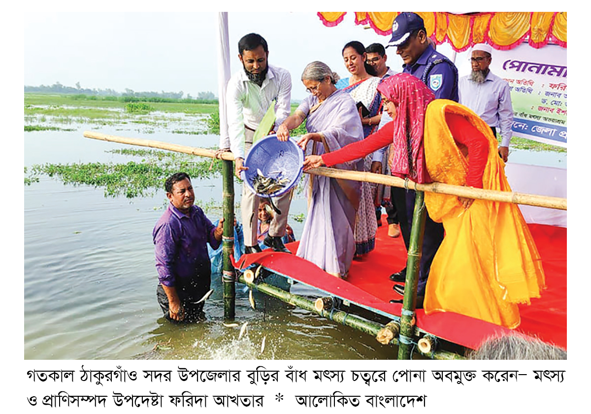 মৎস্য ও প্রাণিসম্পদ মন্ত্রণালয়ের উপদেষ্টা ফরিদা আখতার বলেন, গত বছর প্রতিবেশী দেশ ভারতে ৫০০ টন ইলিশ মাছ রপ্তানি করা হয়েছিল। এ বছর দুর্গাপূজা উপলক্ষে ভারত ১২০০ টন ইলিশ পাঠানোর অনুরোধ করেছে। আমাদের দেশের অন্যতম সম্পদ ইলিশ মাছ সর্বপ্রথম দেশের চাহিদা পূরণ করে রপ্তানি করা হবে। গতকাল শনিবার ঠাকুরগাঁও সদর উপজেলার বুড়ির বাঁধ মৎস্য চত্বরে জেলা প্রশাসন ও মৎস্য অধিদপ্তরের আয়োজনে মৎস্য অবমুক্তকরণ শেষে এক মতবিনিময় সভায় প্রধান অতিথির বক্তব্যে তিনি এসব কথা বলেন। উপদেষ্টা ফরিদা বলেন, দেশের জলজ সম্পদ রক্ষায় অবৈধ জাল উৎপাদন ও ব্যবসার সঙ্গে জড়িতদের কোনোভাবেই ছাড় দেওয়া হবে না। যারা এই কাজ করে, তারা দেশের শত্রু। অবৈধ জাল ব্যবহারকারীরাও সমান অপরাধী। এদের বিরুদ্ধে কঠোর আইনানুগ ব্যবস্থা নেওয়া হবে। ফরিদা আখতার বলেন, প্রাকৃতিক সম্পদ সংরক্ষণে আমাদের সবাইকে সচেতন হতে হবে। দেশের অর্থনীতিতে মৎস্যখাতের গুরুত্বপূর্ণ অবদান রয়েছে। এই খাতকে টিকিয়ে রাখতে হলে অবৈধ কার্যক্রম বন্ধ করতে হবে। জলাশয় রক্ষণাবেক্ষণসহ জেলেদের প্রণোদনা বাড়ানোর বিষয় নিয়েও কথা বলেন তিনি। তিনি বলেন, সবাই সচেতন থেকে বৈধভাবে মাছ মারলে আমরা সবাই সারা বছর দেশি মাছ খেতে পারব। যেহেতু এসব মাছ আমাদের অনেক পুষ্টির যোগান দেয়। এছাড়াও তিনি উত্তরাঞ্চলের জেলা ঠাকুরগাঁওয়ে ইলিশ মাছ সরবরাহের আশ্বাস দেন।