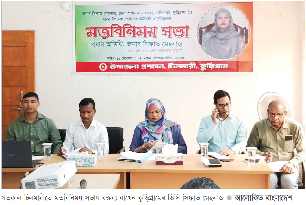 কুড়িগ্রামের চিলমারীতে উপজেলা প্রশাসনের উদ্যোগে নবাগত জেলা প্রশাসক ও জেলা ম্যাজিস্ট্রেট সিফাত মেহনাজের উপজেলা পর্যায়ের কর্মকর্তা ও সুধীজনের সঙ্গে মতবিনিময় সভা অনুষ্ঠিত হয়েছে।