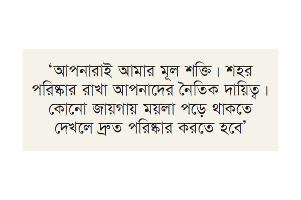 মেয়র পরিচ্ছন্ন কর্মীদের উদ্দেশে বলেন, ‘ডোর টু ডোর প্রকল্প’ আপনাদের সহযোগিতা করার জন্য চালু করা হয়েছিল। কিন্তু এখন দেখা যাচ্ছে, আপনারা গা ছাড়া ভাব দেখাচ্ছেন। মনে রাখতে হবে, আপনারাই আমার মূল শক্তি। শহর পরিষ্কার রাখা আপনাদের নৈতিক দায়িত্ব। কোনো জায়গায় ময়লা পড়ে থাকতে দেখলে দ্রুত পরিষ্কার করতে হবে।