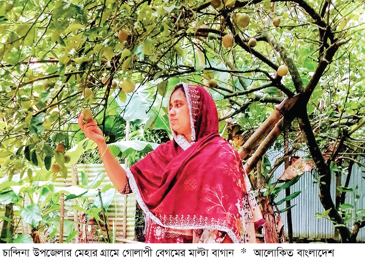 কৃষি নির্ভর বাংলাদেশের গ্রামে গ্রামে নতুন নতুন সম্ভাবনার দ্বার খুলছে ফল চাষ। সেই সম্ভাবনার এক উজ্জ্বল দৃষ্টান্ত হয়ে উঠেছেন কুমিল্লার চান্দিনা উপজেলার মেহার গ্রামের বাসিন্দা গোলাপী বেগম। তিনি একজন সাধারণ গৃহিণী হলেও দৃঢ় মনোবল ও অধ্যবসায়ের মাধ্যমে ঘরের আঙিনাতেই গড়ে তুলেছেন এক অনন্য সাফল্যের গল্প। কয়েক বছর আগে শখের বসে বাড়ির পাশে কয়েকটি মাল্টার চারা লাগিয়েছিলেন তিনি। এখন সেই আঙিনা ভরে উঠেছে থোকায় থোকায় মাল্টার ফলনে।