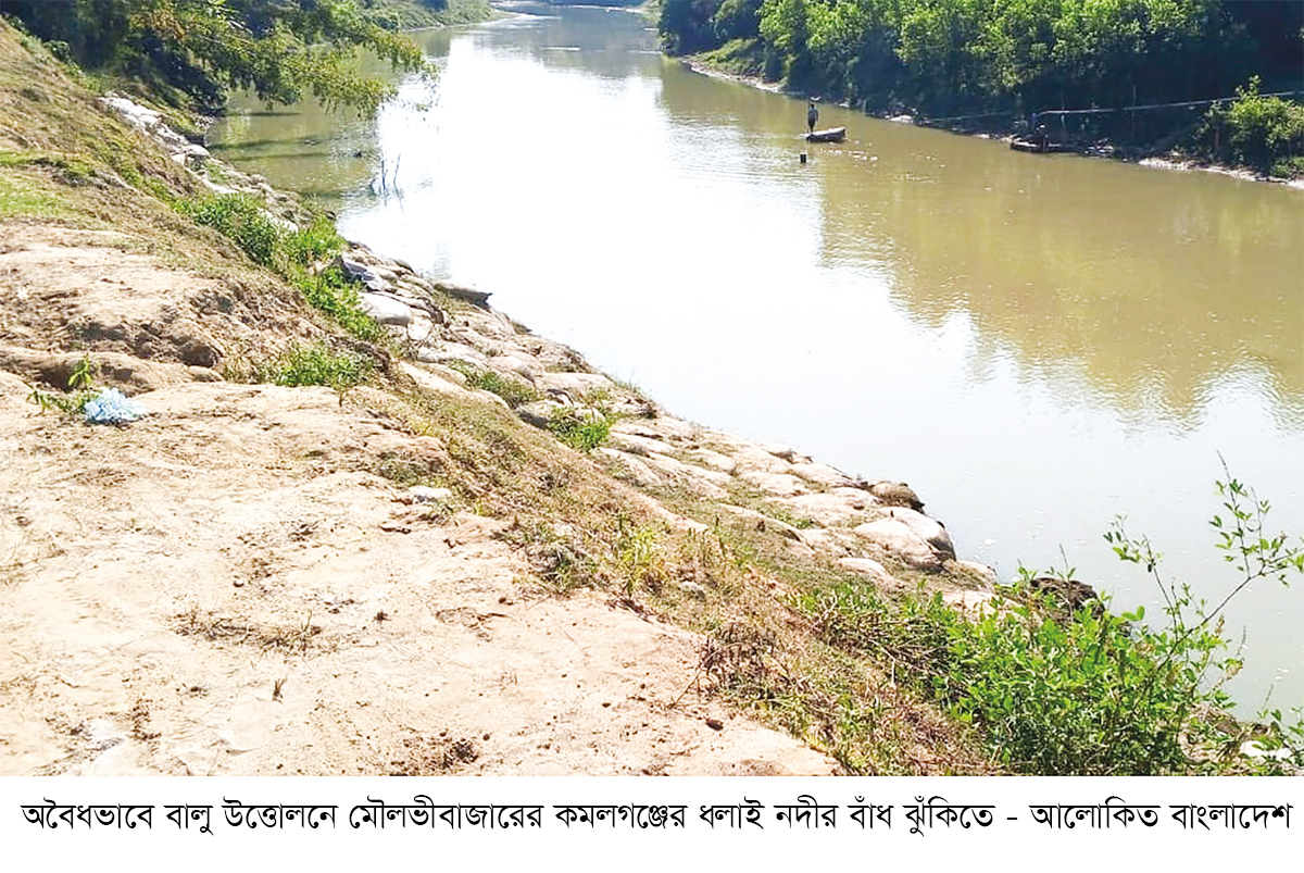 মৌলভীবাজারের কমলগঞ্জে পানি উন্নয়ন বোর্ডের উদ্যোগে ধলাই নদীর ঝুঁকিপূর্ণ প্রতিরক্ষা বাঁধে জিও ব্যাগ স্থাপনের কাজ চলছে। এর অন্যপাশে রহিমপুর ইউনিয়নের মৃর্ত্তিঙ্গা চা বাগানের স্টিল ব্রিজের সন্নিকটে চলছে অবৈধভাবে বালু উত্তোলন। বালু উত্তোলনে নদীর প্রতিরক্ষা বাঁধ ও ব্রিজের ক্ষয়ক্ষতির আশঙ্কায় স্থানীয়রা মৌলভীবাজার জেলা প্রশাসক বরাবরে লিখিত অভিযোগ দিয়েছেন। এরপরও অবৈধভাবে বালু উত্তোলন বন্ধ হচ্ছে না। ফলে হুমকির মুখে পড়েছে ধর্মপুর ও রামচন্দ্রপুর এলাকার ধলাই নদীর প্রতিরক্ষা বাঁধ, দুটি ব্রিজ ও পরিবেশ-প্রতিবেশ।