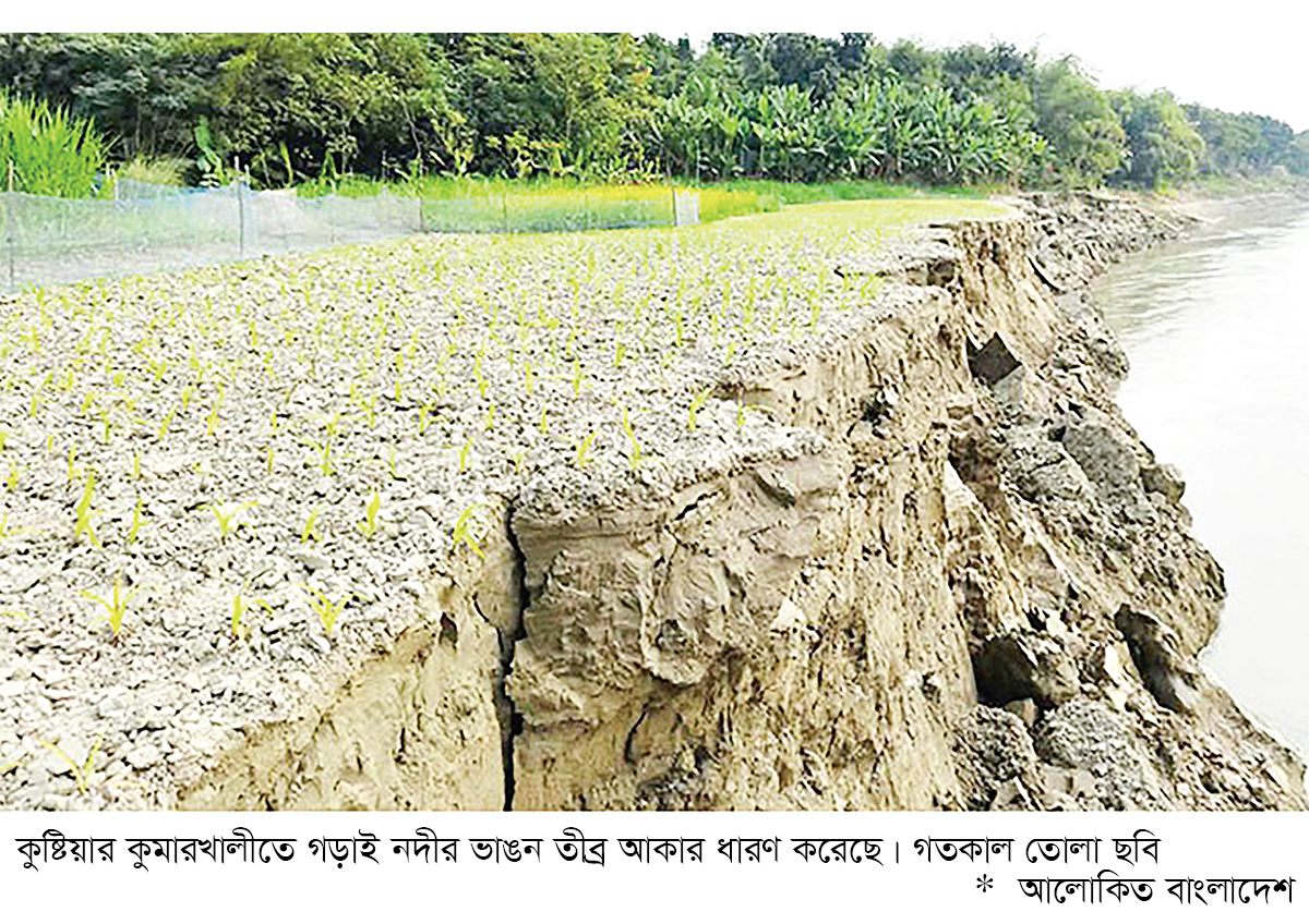 গড়াই নদীর আকস্মিক ভাঙনে প্রায় ৩০ বিঘা ফসলসহ কৃষি জমি ও নদীপাড় ভেঙে নদীতে চলে গেছে। এতে হুমকিতে পড়েছে প্রায় ৫০ বিঘা কৃষিজমি ও আতঙ্কিত হয়ে পড়েছে অন্তত ৩০০টি পরিবারের মানুষ। কুষ্টিয়ার কুমারখালী পৌরসভায় তেবাড়িয়া এলাকার মৃত সেকেন্দার আলীর স্ত্রী মদিনা খাতুন (৬২) আক্ষেপ করে বলছিলেন, ‘তোমারে চাচা চলে গেছে (মারা গেছেন) সেই মেলা দিন। এহেনে (এখানে) ৩০ বছর ধরে বাস করছি। তয় আগে কোনোদিন এ্যাম্বা (এভাবে) ভাঙা দেখিনি। কিছুক্ষণ পর পরই পাড় ভাঙে ঢপ্পাস করে পড়ছে। কখন জানি ঘরখানায় ভাঙে যায় এ ভয়ে আছি।’ তার ভাষ্য, নদীর পানি কমতে শুরু করেছে। এ বছর চর জেগেছে নদীর মধ্যে। কিনারা দিয়ে স্রোত গড়ছে। আর পাড় ভেঙে ভেঙে পড়ছে। দ্রুত ব্যবস্থা গ্রহণের দাবি তার।
