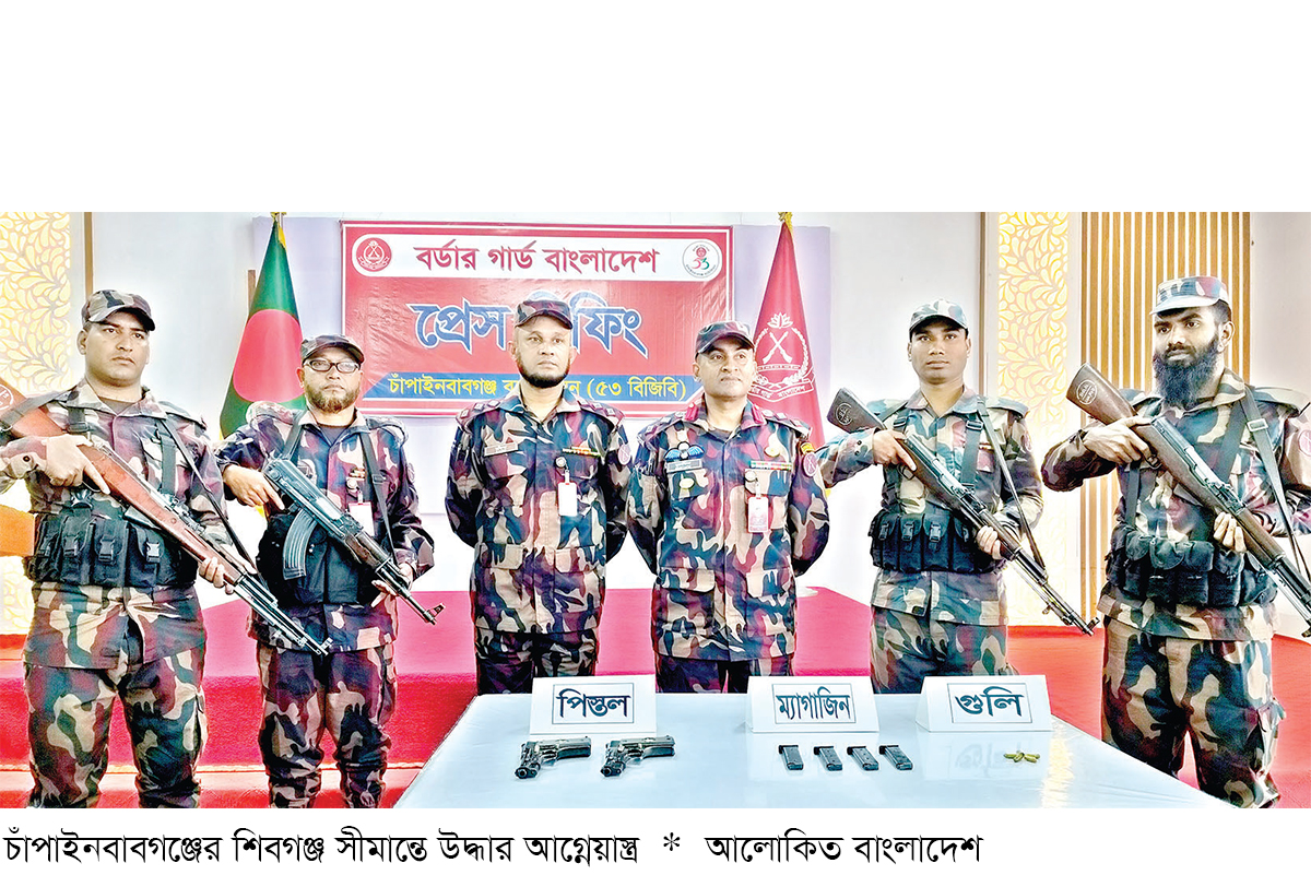 চাঁপাইনবাবগঞ্জের শিবগঞ্জ সীমান্তে বিজিবির অভিযানে আবারও বিদেশি আগ্নেয়াস্ত্র উদ্ধার করা হয়েছে। গতকাল মঙ্গলবার বেলা সাড়ে ১১টার দিকে উপজেলার মনাকষা ইউনিয়নের রাঘববাটি এলাকায় অভিযান চালিয়ে ২টি বিদেশি পিস্তল, ৪টি ম্যাগাজিন ও ৫ রাউন্ড গুলি উদ্ধার করা হয়। তবে বিজিবির উপস্থিতি টের পেয়ে এসব অবৈধ অস্ত্র ফেলে পালিয়ে যাওয়ায় কাউকে গ্রেপ্তার করা সম্ভব হয়নি। এদিন বিকালে ৫৩ বিজিবি ব্যাটালিয়নের সদর দপ্তরে আয়োজিত এক সংবাদ সম্মেলনে এসব তথ্য জানিয়েছেন ব্যাটালিয়নের অধিনায়ক লে. কর্নেল কাজী মুস্তাফিজুর রহমান। তিনি দাবি করেন, দেশের আইনশৃঙ্খলা পরিস্থিতি বিশৃঙ্খল করতে এসব অস্ত্র ভারত থেকে আনা হচ্ছে।