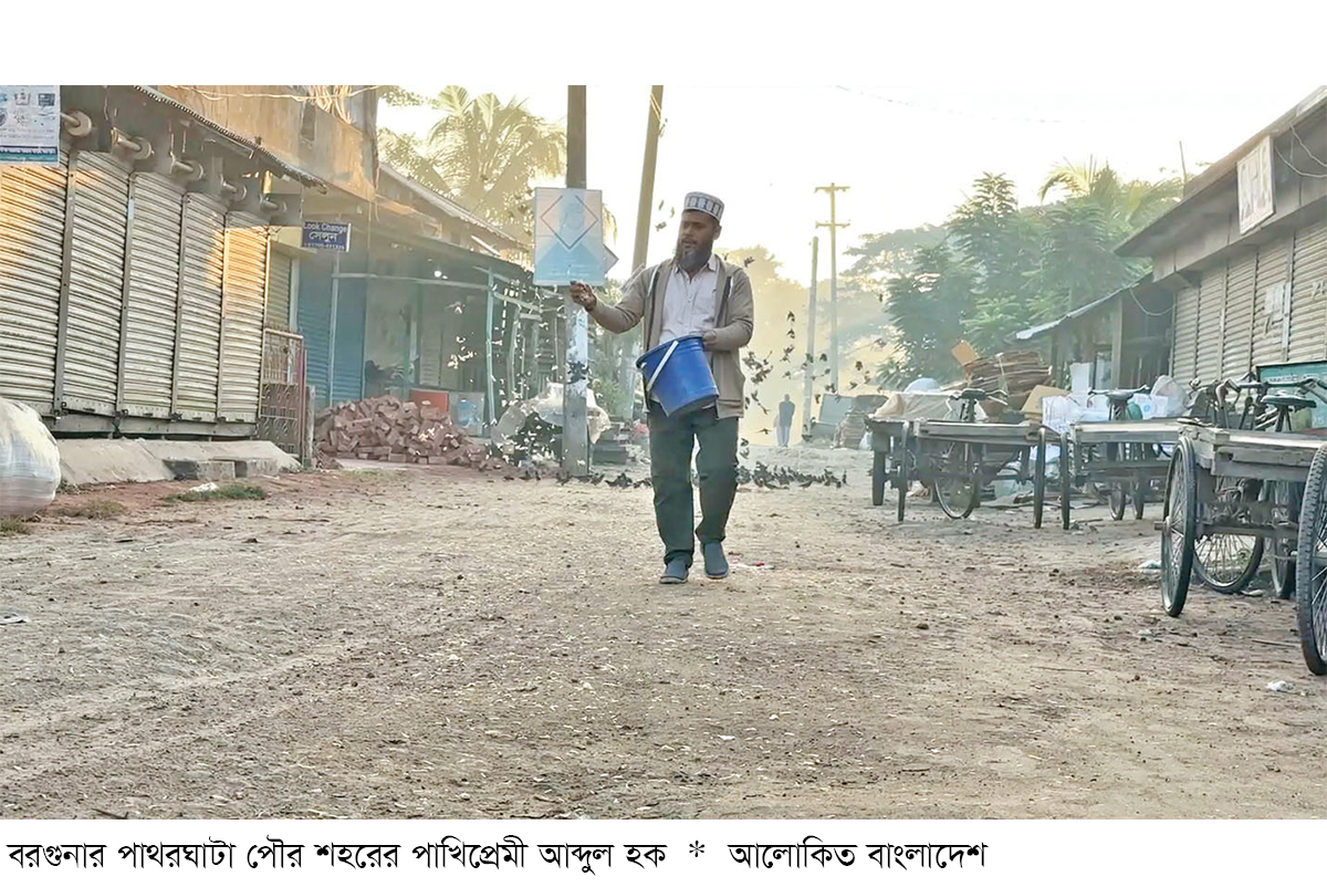 বরগুনার পাথরঘাটা পৌর শহরের তালতলা বাসস্ট্যান্ড সংলগ্ন এলাকায় প্রতিদিন সূর্য ওঠার আগেই শুরু হয় এক অনন্য মানবিক দৃশ্য। স্থানীয় একটি হোটেলের মালিক ও পাখিপ্রেমী আব্দুল হক ভোরবেলায় নিজ হাতে খাবার ছড়িয়ে দেন অসংখ্য পাখির জন্য। টানা ১৮ বছর ধরে চলা এই নিরবচ্ছিন্ন ভালোবাসার বন্ধনে তিনি এলাকাবাসীর কাছে পরিচিত হয়ে উঠেছেন ‘পাখি বাবা’ নামে। কেউ কেউ আদর করে তাকে ডাকেন ‘শালিক বন্ধু’। ভোরের আলো ফোটার সঙ্গে সঙ্গেই আকাশে ভিড় জমায় হাজার হাজার পাখি। শালিক, কাক, চড়ুই, দোয়েল, বুলবুলিসহ নানা প্রজাতির পাখি আব্দুল হককে দেখামাত্রই কিচিরমিচির শব্দে পুরো এলাকা মুখর করে তোলে। তিনি খাবার ছড়িয়ে দিলেই পাখিরা যার যার মতো করে আহার সেরে আবার উড়ে যায়। কোথা থেকে এত পাখির সমাগম ঘটে, তা আজও রহস্যই রয়ে গেছে।