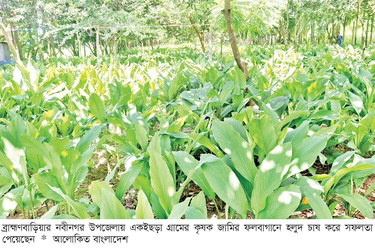 ব্রাহ্মণবাড়িয়ার নবীনগরে নাটঘর ইউনিয়নের একইছড়া গ্রামের কৃষক জামির ফলবাগানের অব্যবহৃত ছায়াযুক্ত জমিতে হলুদ চাষ করে যেমন আর্থিকভাবে লাভবান হয়েছেন, তেমনি এলাকার কৃষকদের সামনে খুলে দিয়েছেন নতুন একটি সম্ভাবনাময় পথ। উপসহকারী কৃষি অফিসার ফারুক আহমেদের পরামর্শে ফ্ল্যাড রিকনস্ট্রাকশন ইমারজেন্সি এসিস্ট্যান্স প্রজেক্টের আওতায় জামির তার মিশ্র ফলবাগানে বারি হলুদণ্ড১ জাতের হলুদ আবাদ করেন। সাধারণত ফলগাছের নিচের ছায়াযুক্ত জমি যেখানে অব্যবহৃত থাকে, সেখানে হলুদ চাষ করে তিনি জমির সর্বোচ্চ ব্যবহার নিশ্চিত করেন। মাত্র ১৫ শতাংশ জমিতে হলুদ আবাদ করে তিনি প্রায় ২০ মণ কাঁচা হলুদ উৎপাদন করতে সক্ষম হন।