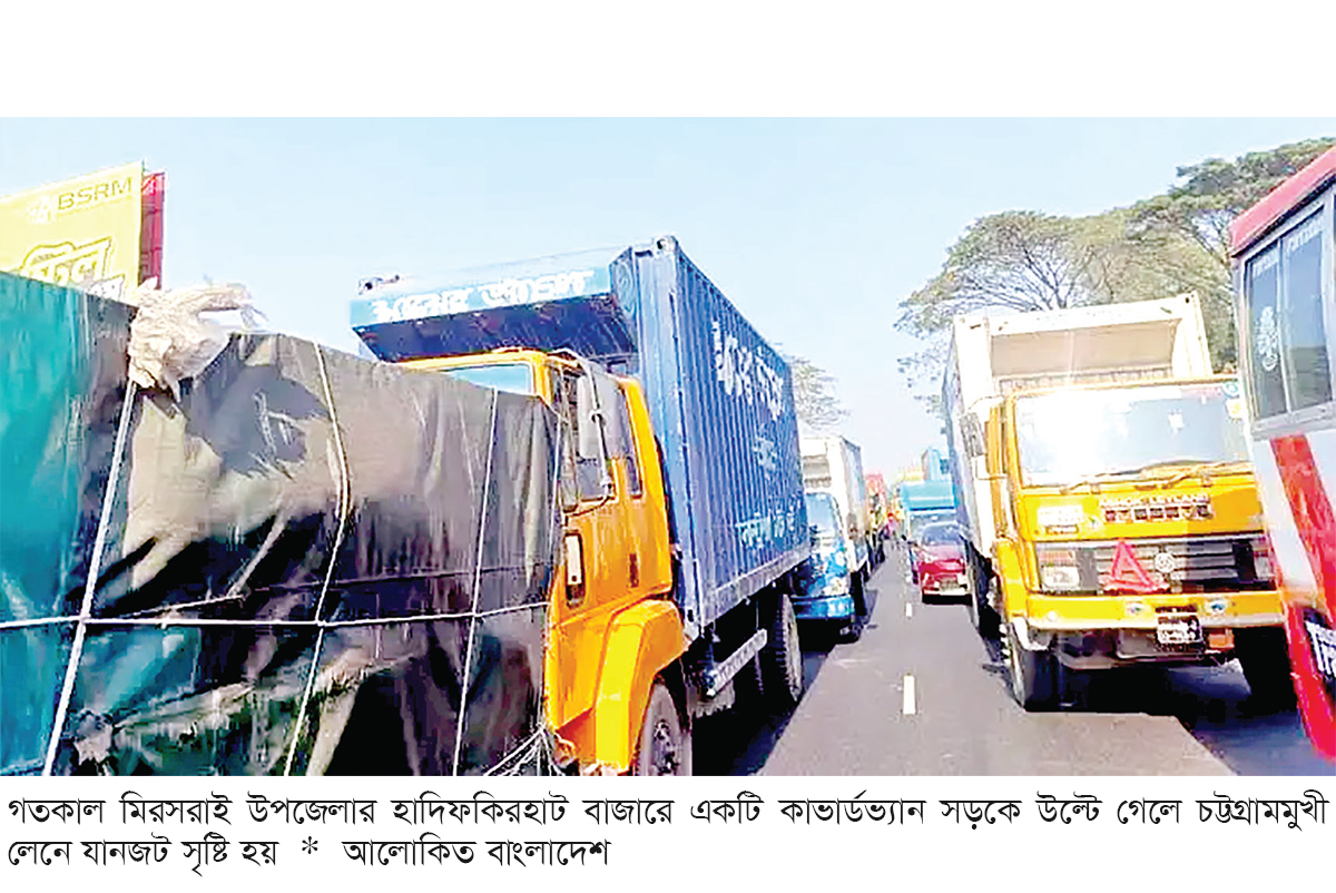 গতকাল সোমবার সকালে মিরসরাই উপজেলার হাদিফকিরহাট বাজারে একটি কাভার্ডভ্যান সড়কে উল্টে গেলে চট্টগ্রামমুখী লেনে এই যানজট সৃষ্টি হয়। সরেজমিনে দেখা গেছে, মহাসড়কের হাদিফকিরহাট থেকে মিরসরাই সদর পর্যন্ত প্রায় ১০ কিলোমিটারজুড়ে গাড়িগুলো দাঁড়িয়ে রয়েছে। কিছুক্ষণ পর ১৫-২০ গজ চলে, আবার দাঁড়িয়ে থাকে।