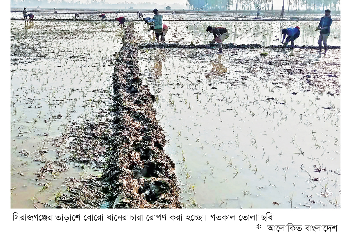 সিরাজগঞ্জে মৌসুমি ইরি বোরো ধানের চাষাবাদ শুরু হয়েছে। এ চাষাবাদে কৃষকেরা এখন ব্যস্ত সময় পার করছে। এরইমধ্যে প্রায় ২৯ হাজার হেক্টর জমিতে চারা রোপণ করা হয়েছে। তবে শীতজনিত কারণে এ চাষে কিছুটা বিলম্ব ঘটছে। সংশ্লিষ্ট সূত্রে জানা যায়, জেলার ৯টি উপজেলার বিভিন্ন স্থানে ১ লাখ ৪১ হাজার ৭৫০ হেক্টর জমিতে ইরি বোরো চাষাবাদের লক্ষ্যমাত্রা নির্ধারণ করা হয়েছে। চলতি মাসের দ্বিতীয় সপ্তাহ থেকে এ ইরি বোরো চাষাবাদ শুরু করেছে কৃষকেরা। বিশেষ করে এ জেলার নিম্নাঞ্চল শস্যভান্ডার খ্যাত সিরাজগঞ্জের চলনবিল এলাকার তাড়াশ, উল্লাপাড়া, রায়গঞ্জ ও শাহজাদপুর উপজেলার পশ্চিমাঞ্চলে এ চাষাবাদ শুরু হয়েছে এবং এ ধানের চারা রোপণে জমি প্রস্তুতও করছে কৃষকেরা। এছাড়াও সেচ কাজে ব্যবহৃত ড্রেনও সংস্কার চলছে। কৃষকরা বলছেন, এবার ইরি বোরো চাষাবাদে খরচ অনেকটা কম হয়ে থাকে। এ কারণে প্রতিবছরে ন্যায় এবারও কৃষকেরা এ চাষাবাদে ঝুঁকে পড়েছে। কৃষকেরা জমিতে মিনিকেট, কাটারিভোগ ও ব্রি-২৯ উল্লেখযোগ্যসহ বিভিন্ন জাতের ধান চাষাবাদ করা হচ্ছে। বিশেষ করে ডিসেম্বর ও জানুয়ারি মাসের মাঝামাঝি প্রচণ্ড শীতজনিত কারণে অনেক বীজতলা বিনষ্ট হয়েছে।
