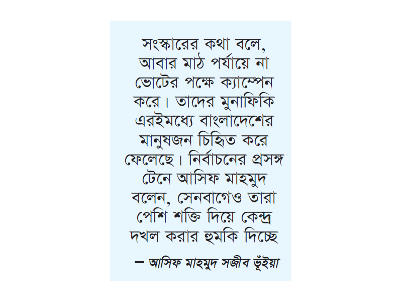 আসিফ মাহমুদ বিএনপিকে ইঙ্গিত করে বলেন, তারা কৃষক এবং শ্রমিকদের পেনশন চালু করার প্রতিশ্রুতি দিয়েছিল। তারা পাঁচ বছর ক্ষমতায় থেকে একটি প্রতিশ্রুতিও বাস্তবায়ন করেনি। সুতারাং এখন যতই কৃষক কার্ড, ফ্যামেলি কার্ড, যত কার্ডের কথাই বলুক না কেন, বাংলাদেশের মানুষ জানে, মানুষের অভিজ্ঞতা আছে। আপনারা কোনো কথাই রাখবেন না। তিনি আরও বলেন, আমরা একটি দলকে বার বার বলতে শুনি সংস্কারের কথা। তারাই নাকি প্রথম সংস্কারের কথা বলেছিল। কিন্তু তারা বিভিন্ন জায়গায় সমাবেশ করছে, মানুষের কাছে ভোট চাচ্ছে। কিন্তু একটা বারেও তাদের দলীয় প্রধানকে সংস্কারের কিংবা গণভোটের কথা মুখেও আনতে দেখি নাই। তারা অন্যান্য দলকে বলে মুখে এক, মনে আরেক। অথচ তাদেরও আমরা দেখতেছি তারা মুখে এক, মনে আরেক। একদিকে তাদের কেউ কেউ সংস্কারের কথা বলে, আবার মাঠ পর্যায়ে না ভোটের পক্ষে ক্যাম্পেন করে। তাদের মুনাফিকি এরইমধ্যে বাংলাদেশের মানুষজন চিহিৃত করে ফেলেছে। নির্বাচনের প্রসঙ্গ টেনে আসিফ মাহমুদ বলেন, সেনবাগেও তারা পেশি শক্তি দিয়ে কেন্দ্র দখল করার হুমকি দিচ্ছে। বাংলাদেশের মানুষ তিনটি নির্বাচনে ভোট দিতে পারেনি। আমরা ঐক্যবদ্ধ বাংলাদেশের পক্ষ থেকে তাদের হুশিয়ারি করে দিতে চাই। যদি এবার বাংলাদেশের একজন নাগরিককেও তার ভোটধিকার প্রয়োগে কোনো ধরনের বাধা দেওয়া হয়। তাহলে কিন্তু আমরা তা বসে-বসে দাঁড়িয়ে-দাঁড়িয়ে দেখব না। যেখানেই কাউকে ভোট দিতে বাধার সৃষ্টি করা হবে, সেখানেই আমরা প্রতিরোধ গড়ে তুলব।