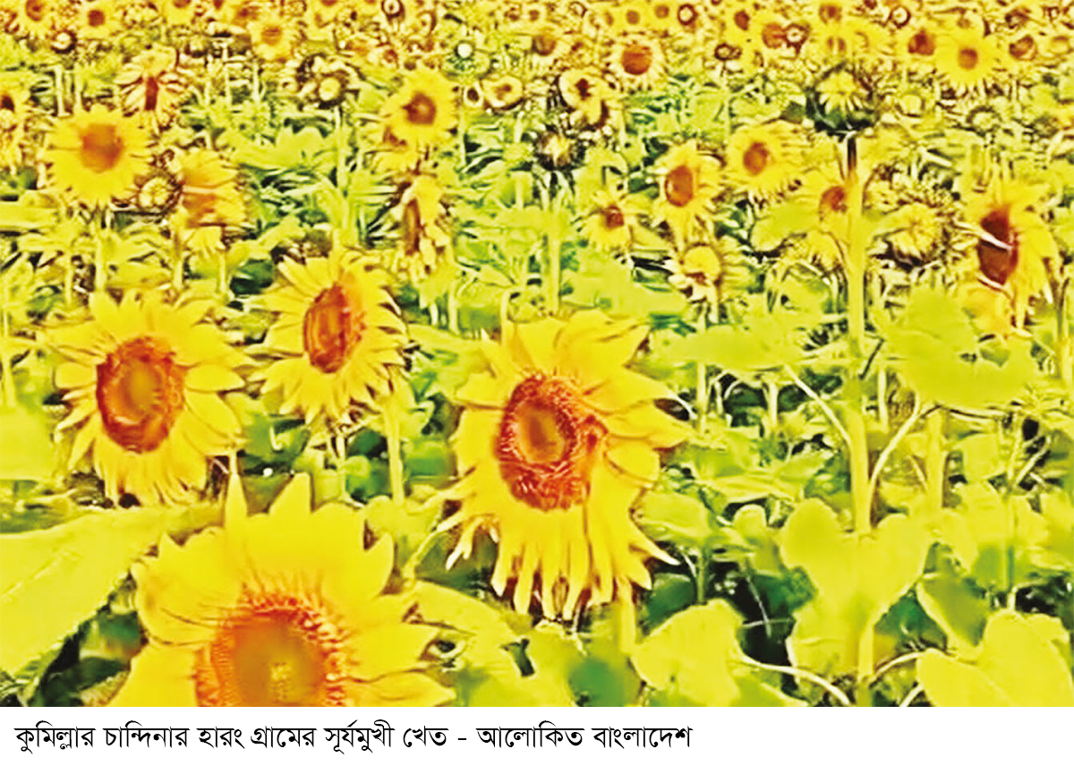 চান্দিনার হারং দক্ষিণ পাড়ার দিগন্তজোড়া মাঠে এখন হলুদের সমারোহ। শীতের শেষভাগে সোনালি রোদে দোল খাচ্ছে হাজারো সূর্যমুখী ফুল। এ যেন প্রকৃতির এক অনন্য রূপের ক্যানভাস। কুমিল্লার চান্দিনা পৌর এলাকার এই হলদে আভা শুধু পথচারীদের চোখই জুড়াচ্ছে না, বরং কৃষক হাবিবুল্লাহর চোখে বুনে দিয়েছে এক নতুন স্বপ্ন। প্রথাগত ফসলের বাইরে গিয়ে সূর্যমুখী চাষ করে তিনি এখন এলাকায় এক সফল দৃষ্টান্ত হিসেবে আবির্ভূত হয়েছেন।