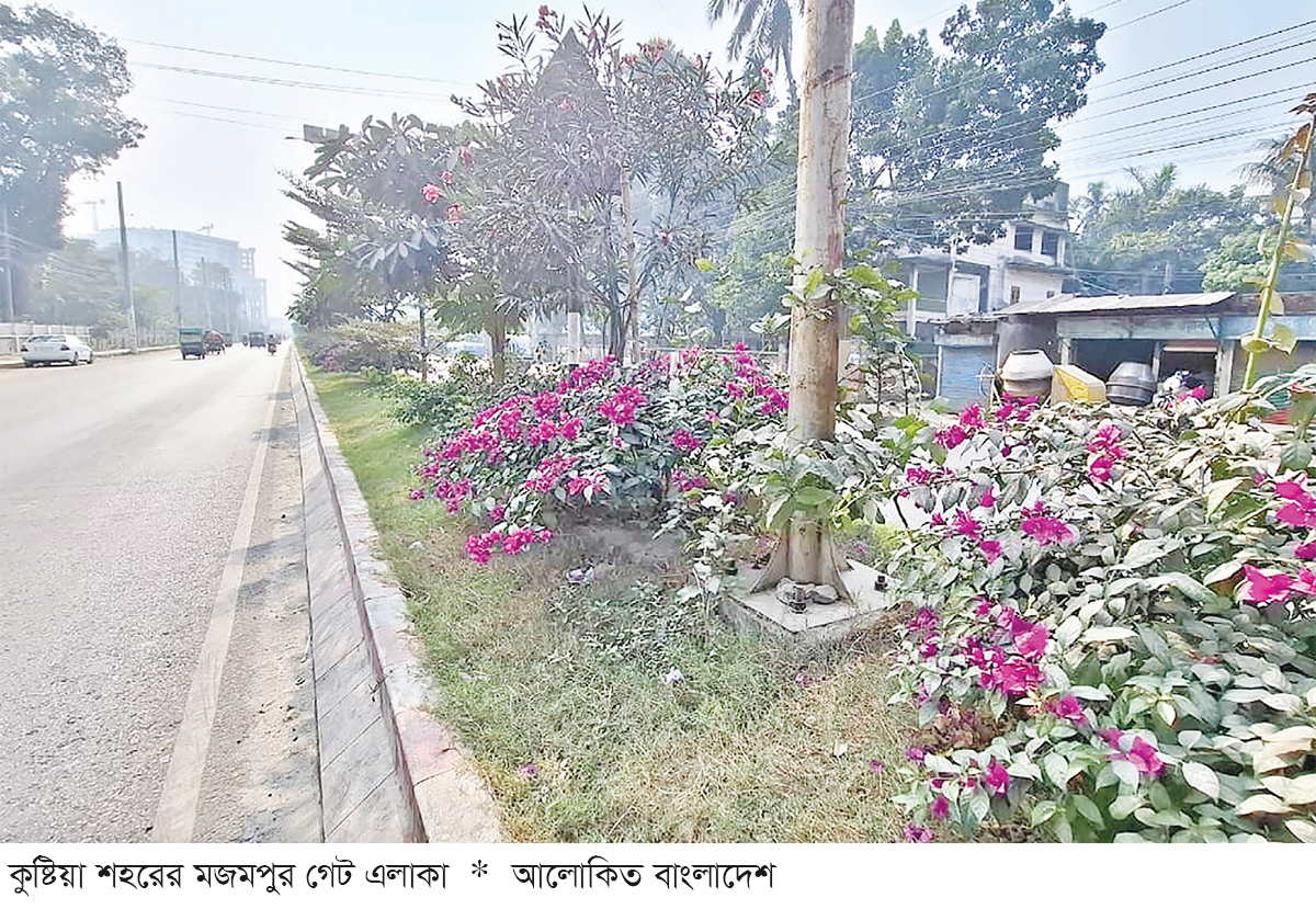 সৌন্দর্যবর্ধক গাছ আর ফুল গাছে ফুটে থাকা বাহারি ফুল বদলে দিয়েছে কুষ্টিয়া জেলা শহরের চিত্র। কুষ্টিয়া শহরের প্রাণকেন্দ্র মজমপুর গেট থেকে ঝিনাইদহ ও ঈশ্বরদীমুখী সড়কের ৮ কিলোমিটার আইল্যান্ডজুড়ে শোভা পাচ্ছে রং-বেরঙের ফুলসহ সৌন্দর্যবর্ধক গাছ। ফুলে ফুলে ছেয়ে গেছে সড়কের আইল্যান্ড। এ দৃশ্য নগরীর বাসিন্দাদের পাশাপাশি পর্যটকদের মনেও প্রশান্তি জোগাচ্ছে। স্বেচ্ছাসেবী সংগঠন ক্লিন কুষ্টিয়া-গ্রিন কুষ্টিয়ার (জিকে-কেকে) এই উদ্যোগের প্রশংসা এখন সবার মুখে মুখে।