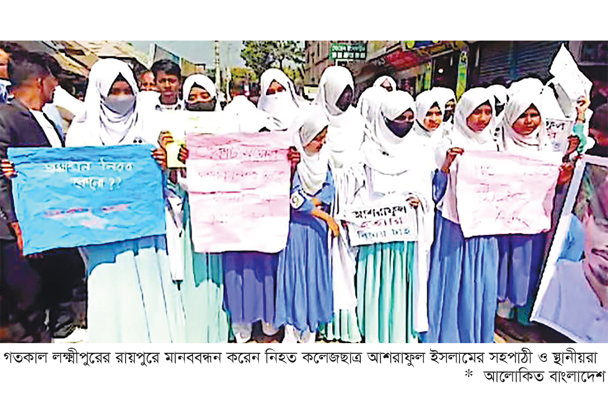 লক্ষ্মীপুরের রায়পুরে কলেজছাত্র আশরাফুল ইসলাম হত্যাকাণ্ডের সঙ্গে জড়িত প্রধান আসামিসহ পলাতক অন্যদের দ্রুত গ্রেপ্তার ও দৃষ্টান্তমূলক শাস্তির দাবিতে ঘণ্টাব্যাপী মানববন্ধন কর্মসূচি পালিত হয়েছে। বক্তারা বলেন, ঘটনার এক মাস পার হলেও মূল আসামিরা গ্রেপ্তার হয়নি। গতকাল বুধবার উপজেলার উত্তর চরবংশী ইউনিয়নের খাসেরহাট বাজারে এ মানববন্ধন অনুষ্ঠিত হয়। এতে নিহতের বাবা আজিজুল হক খান, স্বজন, স্থানীয় গণ্যমান্য ব্যক্তিবর্গ এবং বিভিন্ন শিক্ষাপ্রতিষ্ঠানের শতাধিক শিক্ষার্থী অংশ নেন।