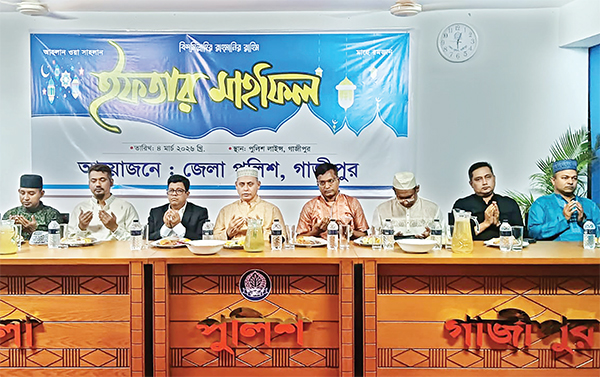 গতকাল গাজীপুর জেলা পুলিশের আয়োজনে ইফতার মাহফিল ও দোয়ার আয়োজন করা হয়। এতে সভাপতিত্ব করেন গাজীপুরের পুলিশ সুপার শরিফ উদ্দিন। প্রধান অতিথি হিসেবে উপস্থিত ছিলেন - গাজীপুর মেট্রোপলিটন পুলিশ কমিশনার ইসরাফিল হাওলাদার * আলোকিত বাংলাদেশ