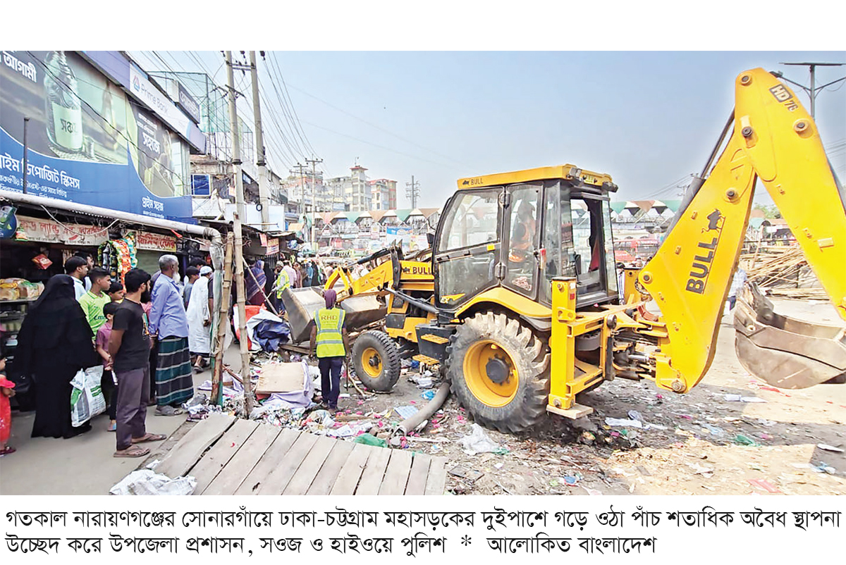 আসন্ন ঈদকে সামনে রেখে জনদূর্ভোগ কমাতে নারায়ণগঞ্জের সোনারগাঁয়ে ঢাকা-চট্টগ্রাম মহাসড়কের দুই পাশে গড়ে ওঠা প্রায় পাঁচ শতাধিক অবৈধ স্থাপনা উচ্ছেদ করেছে উপজেলা প্রশাসন, সওজ ও হাইওয়ে পুলিশ। গতকাল বৃহস্পতিবার সকালে উপজেলার মোগরাপাড়া চৌরাস্তা এলাকায় দিনব্যাপী এ উচ্ছেদ অভিযান পরিচালনা করা হয়। অভিযানে ভ্রাম্যমাণ আদালত পরিচালনা করেন উপজেলা নির্বাহী কর্মকর্তা আসিফ আল জিনাত।