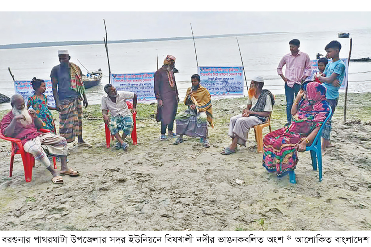 ‘নদী বাঁচাও, মানুষ বাঁচাও’ স্লোগানকে সামনে রেখে পরিবেশ ও জলবায়ু বিষয়ক নাগরিক সংগঠন ধরিত্রী রক্ষায় আমরা (ধরা) ও পাথরঘাটা উপকূল সুরক্ষা আন্দোলনের উদ্যোগে গতকাল শনিবার পাথরঘাটা উপজেলার সদর ইউনিয়নের বিষখালী নদীসংলগ্ন জিনতলা এলাকায় নদী ভাঙনে ক্ষতিগ্রস্ত স্থানীয় বাসিন্দারা অবস্থান কর্মসূচি পালন করেন। এ সময় তারা নদীর তীরে বসে নিজেদের ভাঙনের বেদনার কথা তুলে ধরেন এবং দখল-দূষণমুক্ত নদী ও টেকসই বাঁধ নির্মাণের দাবি জানান।