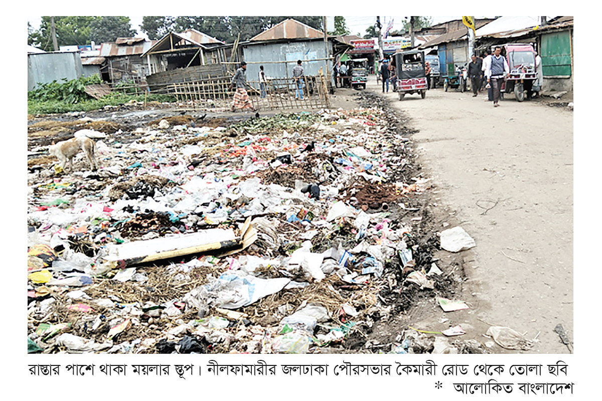 নীলফামারীর জলঢাকা পৌরসভার ৬নং ওয়ার্ডের কৈমারী রোডে রাস্তার পাশ দিনদিন ময়লার ভাগাড়ে পরিণত হচ্ছে। এসব ময়লার স্তূপ থেকে বের হওয়া উৎকট দুর্গন্ধতে চরম বিপাকে পড়েছেন পথচারীসহ পৌরবাসী। পৌরসভার নির্দিষ্ট কোনো কসাইখানা না থাকায় অনেক বছর যাবত ট্রাফিক মোড় সংলগ্ন কৈমারী রোডের পাশের্^ই এ জায়গাটিতে গরু জবাই করে আসছেন মাংস ব্যবসায়ীরা। জবাই হওয়া গরুর রক্ত ও গোবর দিনের পর দিন জমে থাকে এখানে। এছাড়াও সন্ধ্যা হলেই মাছ বাজার, কাঁচা বাজার, বিভিন্ন হেটেল ও ফার্মের মুরগি বিক্রেতাগণ তাদের দোকানের ময়লা আবর্জনাগুলো এই জায়গা ফেলেন। কৈমারী রোডস্থ জমে থাকা এসব ময়লা ১/২ মাস পর পর পৌর কর্তৃপক্ষ অন্যত্রে নিয়ে গিয়ে রাখেন। স্থানীয়দের অভিযোগ কৈমারী রোডের এসব ময়লা নিয়মিত অন্যত্রে নিয়ে না যাওয়ায় দুর্গন্ধের জন্য প্রায় ২০০ গজ পর্যন্ত এলাকাজুড়ে থাকা খুবই কষ্ট হয়। বাধ্য হয়ে নাকে কাপড় কিংবা নিশ্বাস বন্ধ করে এই রাস্তা দিয়ে চলাফেরা করতে হয়। ময়লার স্তূপের সঙ্গেই রয়েছে জলঢাকা দাখিল মাদ্রাসা। এমপিওভুক্ত এ প্রতিষ্ঠানটিতে বর্তমানে ৪৫০ জনের বেশি শিক্ষার্থী লেখাপড়া করছেন। দূর্গন্ধের কারণে অনেক কষ্ট করে ক্লাশ করেন ওই মাদ্রাসার শিক্ষার্থীরা। অনেকে এই গন্ধের জন্যই মাদ্রাসায় কম আসেন। মাদ্রাসার ৮ম শ্রেণীর শিক্ষার্থী রাজিয়া সুলতানা মারিয়াসহ অনেকে জানান,অতিরিক্ত দূর্গন্ধের কারনে আমরা মাঝে মধ্যে মাদ্রাসায় আসি না, আর আসলেও ক্লাস করতে খুবই কষ্ট হয়। মাদ্রাসার ৮ম শ্রেণীর এক শিক্ষার্থীর বাবা সিরাজুল ইসলাম বলেন, এখানে ময়লা ফেলায় পরিবেশ একেবারে নষ্ট হয়ে গেছে। কারও পক্ষে স্বাভাবিক নিঃশ্বাস নিয়ে এ রাস্তা পার হওয়া সম্ভব নয়। আমরা নাক বন্ধ করেই দ্রুত স্থান ত্যাগ করার চেষ্টা করি। আমাদের সন্তানেরা খুব কষ্ট করে মাদ্রাসায় লেখাপড়া করছে।