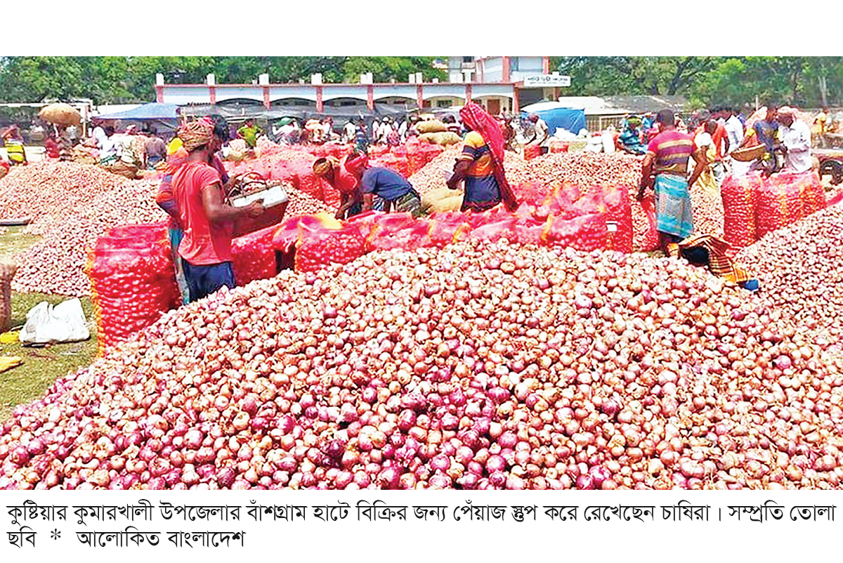 বৃহস্পতিবার আসলেই ভোরের আলো ফুটতে না ফুটতেই হাকডাক শুরু হয়ে যায় কুষ্টিয়া জেলার অন্যতম বড় পেঁয়াজের হাট কুমারখালীর বাঁশগ্রামে। জেলার নানা প্রান্ত থেকে থেকে ভ্যান, নসিমন, সাইকেলসহ নানা যানবাহনে মণে মণে পেঁয়াজ আসছে। চারিদিকে শোরগোল। ক্রেতা আর বিক্রেতাদের দর দামে সরব হয়ে ওঠে বাজার। এ বছর পেঁয়াজের ভালো ফলন পেয়ে খুশি কৃষকরা, তবে বাজারে এসে মণ খারাপ কৃষকদের। গতবারের থেকে প্রতিমণ পেঁয়াজের দাম মণপ্রতি কমেছে ৪০০ থেকে ৫০০ টাকা। কৃষকরা বলছেন, গত দুই বছর ভালো দাম ছিল পেঁয়াজের। এবার উৎপাদনে যে খরচ হয়েছে তাও উঠছে না। ৮ থেকে ১৫ টাকা তাদের লোকসান হচ্ছে প্রতি কেজিতে। রাখার জায়গা না থাকায় অনেকেই কম দামে পেঁয়াজ বিক্রি করে বারি ফিরছেন।