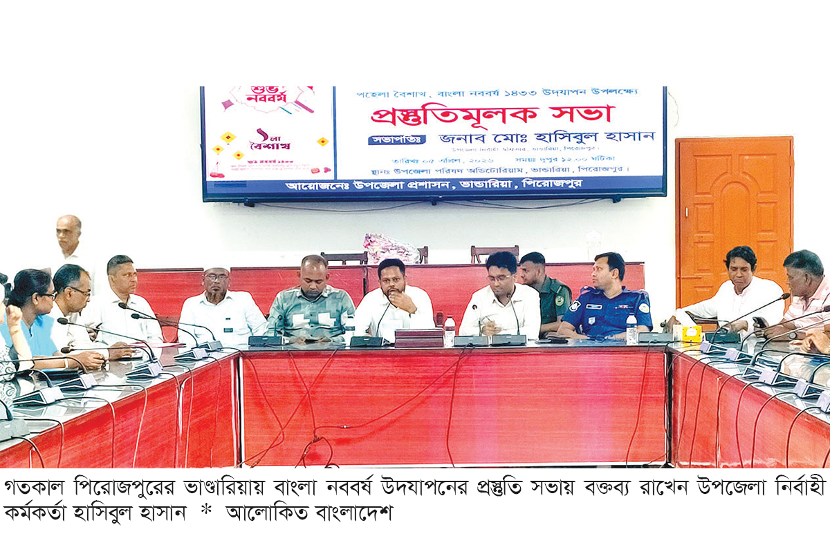 পিরোজপুরের ভাণ্ডারিয়ায় বাংলা নববর্ষ ১৪৩৩ উদযাপনকে ঘিরে ব্যাপক কর্মসূচি গ্রহণ করা হয়েছে। এ উপলক্ষে গতকাল রোববার উপজেলা প্রশাসন ও উপজেলা পরিষদের উদ্যোগে রোববার দুপুরে উপজেলা অডিটরিয়ামে এক প্রস্তুতি সভা অনুষ্ঠিত হয়। সভায় সভাপতিত্ব করেন নবাগত উপজেলা নির্বাহী কর্মকর্তা ও পৌর প্রশাসক মো. হাসিবুল হাসান। এতে বক্তব্য দেন উপজেলা সহকারী কমিশনার (ভূমি) উজ্জ্বল হালদার, ভাণ্ডারিয়া থানার অফিসার ইনচার্জ (ওসি) দেওয়ান জগলুল হাসানসহ অন্যান্যরা।