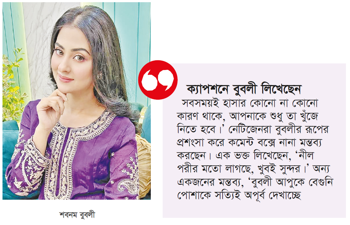 ক্যাপশনে বুবলী লিখেছেন, ‘সবসময়ই হাসার কোনো না কোনো কারণ থাকে, আপনাকে শুধু তা খুঁজে নিতে হবে।’ নেটিজেনরা বুবলীর রূপের প্রশংসা করে কমেন্ট বক্সে নানা মন্তব্য করছেন। এক ভক্ত লিখেছেন, ‘নীল পরীর মতো লাগছে, খুবই সুন্দর।’ অন্য একজনের মন্তব্য, ‘বুবলী আপুকে বেগুনি পোশাকে সত্যিই অপূর্ব দেখাচ্ছে।’ অধিকাংশ অনুরাগীই তার মিষ্টি হাসির প্রশংসা করেছেন।