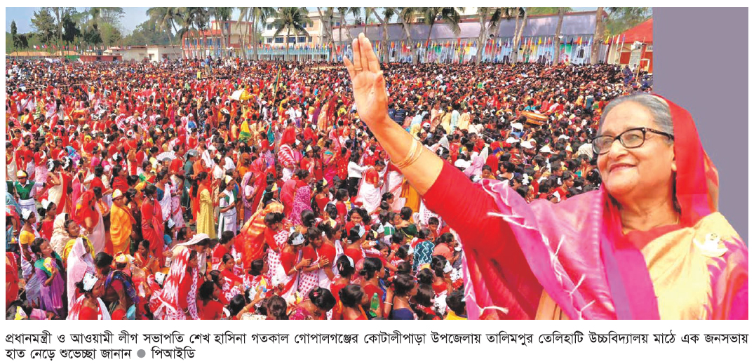 শেখ হাসিনা গতকাল বিকালে কোটালীপাড়া উপজেলা আওয়ামী লীগ আয়োজিত সাদুল্যাপুর ইউনিয়নের তালিমপুর তেলিহাটি উচ্চ বিদ্যালয় মাঠে অনুষ্ঠিত বিশাল জনসভায় প্রধান অতিথির বক্তব্যে এসব কথা বলেন। এর আগে সমাবেশস্থলে ফলক উন্মোচনের মাধ্যমে ৩২৯ কোটি টাকা ব্যয়ে ৪৩টি উন্নয়ন প্রকল্পের উদ্বোধন এবং অপর পাঁচটি প্রকল্পের নির্মাণ কাজের ভিত্তিপ্রস্তর স্থাপন করেন তিনি।