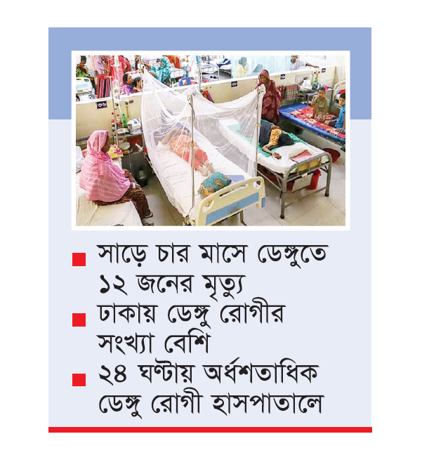 চলতি বছরে এখন পর্যন্ত ডেঙ্গু আক্রান্ত হয়ে ১২ জনের মৃত্যু হয়েছে। আর রাজধানীসহ সারা দেশে ডেঙ্গু রোগীর সংখ্যা বাড়ছে। গতকাল ২৪ ঘণ্টায় অর্ধশতাধিক ডেঙ্গু রোগী হাসপাতালে ভর্তি হয়েছেন। এ নিয়ে বর্তমানে দেশের বিভিন্ন সরকারি-বেসরকারি হাসপাতালে ১৬২ জন ডেঙ্গু রোগী ভর্তি আছেন। তবে, গত ২৪ ঘণ্টায় ডেঙ্গু রোগীর মৃত্যু হয়নি।