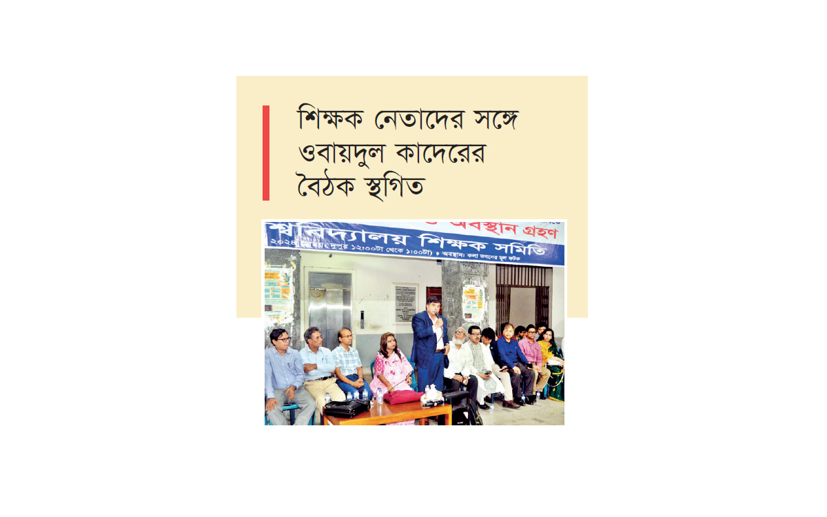 এদিকে, সর্বজনীন পেনশনের ‘প্রত্যয়’ কর্মসূচির প্রজ্ঞাপন বাতিলের দাবিতে শিক্ষক, কর্মকর্তা-কর্মচারীদের একযোগে সর্বাত্মক কর্মবিরতিতে অচল হয়ে পড়েছে বিভিন্ন পাবলিক বিশ্ববিদ্যালয়। এমন পরিস্থিতিতে শিক্ষক নেতাদের সঙ্গে গতকাল বৃহস্পতিবার ক্ষমতাসীন আওয়ামী লীগের সাধারণ সম্পাদক এবং সড়ক পরিবহন ও সেতুমন্ত্রী ওবায়দুল কাদেরের যে বৈঠক হওয়ার কথা ছিল, তা স্থগিত করা হয়েছে। কারণ হিসেবে ওবায়দুল কাদেরের রাষ্ট্রীয় কাজে ব্যস্ততার কথা বলা হেেয়ছে। যদিও টানা চার দিন ধরে সর্বাত্মক কর্মবিরতি পালনে এতে অচল হয়ে পড়েছে ঢাকা বিশ্ববিদ্যালয়সহ ৩৫টি পাবলিক ও সরকারি বিশ্ববিদ্যালয়ের শিক্ষা কার্যক্রম।