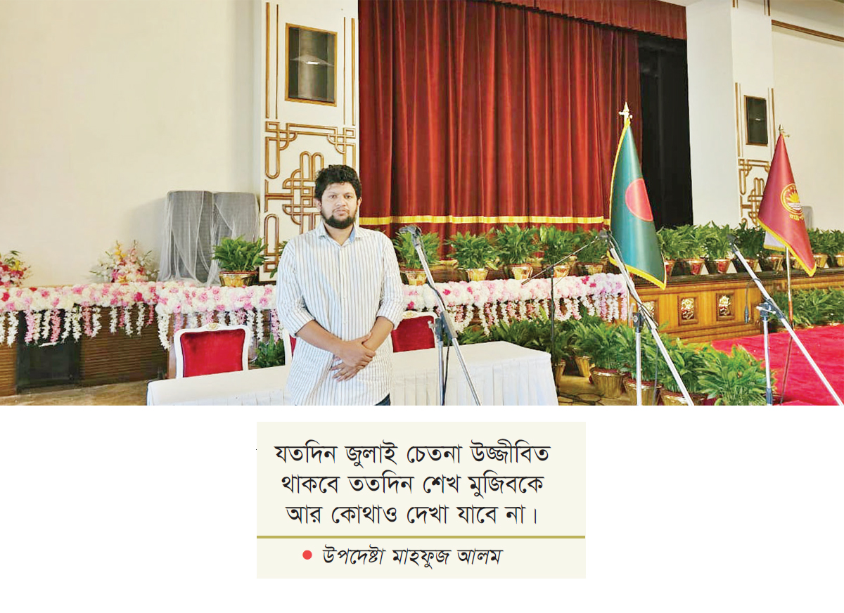 ড. মুহাম্মদ ইউনূসের নেতৃত্বাধীন অন্তর্বর্তী সরকারে সদ্য যুক্ত হওয়া উপদেষ্টা মাহফুজ আলম সামাজিক যোগাযোগ মাধ্যম ফেসবুকে এক পোস্টে লিখেছেন, যতদিন জুলাই’র চেতনা উজ্জীবিত থাকবে ততদিন শেখ মুজিবকে আর কোথাও দেখা যাবে না। গতকাল সোমবার দুপুর ১২টার দিকে একটি ছবিসহ ভেরিফায়েড ফেসবুক প্রোফাইলে একটি স্ট্যাটাস দেন। ১ ঘণ্টায় এই পোস্টে ১১ হাজারের বেশি রিয়েকশন পড়েছে। পোস্টটি প্রায় ১১শ মানুষ শেয়ার করেছেন। পোস্টে মাহফুজ আলম লিখেছেন, দরবার হল থেকে একাত্তর পরবর্তী ফ্যাসিস্ট শেখ মুজিবুর রহমানের ছবি সরিয়ে নেয়া হয়েছে। এটা আমাদের জন্য লজ্জার যে ৫ আগস্টের পর বঙ্গভবন থেকে আমরা তার ছবি সরাতে পারিনি। এর জন্য আমরা ক্ষমাপ্রার্থী। কিন্তু যতদিন মানুষের মধ্যে জুলাই’র চেতনা উজ্জীবিত থাকবে ততদিন তাকে আর কোথাও দেখা যাবে না। তিনি আরো লিখেছেন, ৭২’ এর অগণতান্ত্রিক সংবিধান থেকে দুর্ভিক্ষ, শত শত কোটি টাকা পাচার, ভিন্নমতাবলম্বী এবং বিরোধীদের বিচারবহির্ভূত হত্যা (৭২-৭৫, ২০০৯-২০২৪), শেখ মুজিব এবং তার মেয়ে শেখ হাসিনা বাংলাদেশের জনগণের সঙ্গে যা করেছে আওয়ামী লীগকে অবশ্যই তা স্বীকার করতে হবে এবং এর জন্য ক্ষমা চাইতে হবে। তারপর আমরা একাত্তর পূর্ববর্তী শেখ মুজিবকে নিয়ে আলোচনা করতে পারি। ক্ষমাপ্রার্থনা এবং ফ্যাসিস্টদের বিচারের আগে তাদের পুনর্বাসনের কোনো সুযোগ নেই। এদিকে গত রোববার সন্ধ্যায় নোবেলজয়ী ড. মুহাম্মদ ইউনূসের নেতৃত্বাধীন অন্তর্বর্তী সরকারে যুক্ত হন নতুন তিন জন উপদেষ্টা। সন্ধ্যায় বঙ্গভবনে তাদের শপথ পড়ান রাষ্ট্রপতি মো. সাহাবুদ্দিন। নতুন করে যুক্ত হওয়া তিন উপদেষ্টার মধ্যে রয়েছেন মাহফুজ আলম। তবে উপদেষ্টা মাহফুজ আলমকে এখনো কোনো মন্ত্রণালয়ের দায়িত্ব দেয়া হয়নি। তিনি বৈষম্যবিরোধী ছাত্র আন্দোলনের লিয়াজোঁ কমিটির সমন্বয়ক ছিলেন। তার বাড়ি লক্ষ্মীপুর উপজেলার রামগঞ্জ উপজেলার ইসাপুর গ্রামে। ঢাকা বিশ্ববিদ্যালয়ের আইন বিভাগের ২০১৫-১৬ শিক্ষাবর্ষের শিক্ষার্থী তিনি। এ ছাড়া ছাত্রসংগঠন গণতান্ত্রিক ছাত্রশক্তির তাত্ত্বিক নেতা হিসেবে ক্যাম্পাসে পরিচিত তিনি। বৈষম্যবিরোধী ছাত্র আন্দোলনের নেতৃত্বে ছাত্রশক্তির নেতারাই ছিলেন শুরু থেকে। এর আগে গত ২৮ আগস্ট বৈষম্যবিরোধী ছাত্র আন্দোলনের অন্যতম সমন্বয়ক মো. মাহফুজ আলমকে প্রধান উপদেষ্টার বিশেষ সহকারী পদে চুক্তিভিত্তিক নিয়োগ দেয়া হয়েছিল।