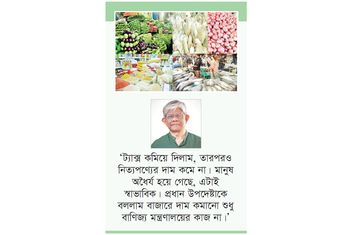 আমদানি পর্যায়ে নিত্যপণ্যের শুল্ক কমানো হলেও ‘বাজারে বিশৃঙ্খলার কারণে’ দাম কমছে না বলে মন্তব্য করেছেন অর্থ উপদেষ্টা সালেহ উদ্দিন আহমেদ। গতকাল বুধবার পল্লী কর্মসহায়ক ফাউন্ডেশন (পিকেএসএফ) আয়োজিত ‘পিকেএসএফ দিবসের’ অনুষ্ঠানে তিনি বলেন, ‘বাজারে এতভাবে বিশৃঙ্খলা সৃষ্টি হয়েছে, মানুষ বলছে দাম কমছে না, অথচ এনবিআর অনেক সুবিধা দিয়েছে।’ দুই অঙ্কে পৌঁছে যাওয়া মূল্যস্ফীতিতে লাগাম দিতে সরকার আমদানি পর্যায়ে চালের পাশাপাশি পেঁয়াজ, আলু আর ভোজ্যতেলের শুল্ক কমিয়েছে। কিন্তু তার কোনো প্রভাব খুচরা বাজারে নেই। বরং গত এক মাসে আলুর দাম কেজিতে ১৫ থেকে ২০ টাকা, চালের দাম কেজিতে ৪ থেকে ৫ টাকা, খোলা সয়াবিন তেলের দাম লিটারে ১০ থেকে ১২ টাকা, পেঁয়াজের দাম ২৫ থেকে ৩৫ টাকা, রসুনের দাম ২০ থেকে ৪০ টাকা বেড়েছে। এসব পণ্যের দর বৃদ্ধি স্বল্প আয়ের মানুষদের জীবন আরও কঠিন করে তুলেছে, কারণ স্বল্প আয়ের মানুষ তাদের খাদ্যের পেছনে আয়ের বেশিরভাগ ব্যয় করেন এসব পণ্য কিনতেই। পয়েন্ট টু পয়েন্ট ভিত্তিতে গত আগস্টে খাদ্য খাতে ১১ দশমিক ৩৬ শতাংশ মূল্যস্ফীতি হয়েছিল, সেপ্টেম্বরে তা ছিল ১০ দশমিক ৪০; আর অক্টোবরে হয়েছে ১২ দশমিক ৬৬ শতাংশ মূল্যস্ফীতি। কয়েক দিন আগেও বাণিজ্য মন্ত্রণালয়ের দায়িত্ব সামলানো সালেহ উদ্দিন আহমেদ পিকেএসএফের অনুষ্ঠানে বলেন, ‘ট্যাক্স কমিয়ে দিলাম, তারপরও নিত্যপণ্যের দাম কমে না। মানুষ অধৈর্য হয়ে গেছে, এটাই স্বাভাবিক। প্রধান উপদেষ্টাকে বললাম বাজারে দাম কমানো শুধু বাণিজ্য মন্ত্রণালয়ের কাজ না।’ নিজের অভিজ্ঞতা থেকে দাম না কমার কারণ ব্যাখ্যা করতে গিয়ে উপদেষ্টা বলেন, ‘এখানে অনেকগুলো ফ্যাক্ট আছে। মানুষের বাজারে কষ্ট হচ্ছে ৫০০ টাকা নিয়ে গেল দুমুঠো শাক, অন্য কিছু কিনে টাকা শেষ হলো। আমি চেষ্টা করছি বাজারে দাম কমানোর জন্য।’ ভারতে ইলিশ রপ্তানিকে কেন্দ্র করে সামাজিক মাধ্যমে নেতিবাচক প্রতিক্রিয়ার মুখোমুখি হলেও বিষয়টি ইতিবাচক হিসেই দেখতে চান সাবেক গভর্নর সালেহ উদ্দিন। তিনি বলেন, ‘আমার ছোট ভাই ফোন দিয়ে বলে ভাই, ইলিশ মাছ দিয়ে দিলেন, ফেইসবুকে আপনাকে গালি দিয়ে ভরে দিচ্ছে। আমার কিন্তু ফেইসবুক নাই। একটা সিজনে ৫ লাখ ৩০ হাজার টন ইলিশ উৎপাদন হয়, ভারতে দিলাম মাত্র ৩ হাজার টন। অনেকে বলছে ভারতে ইলিশ দেয়া ভালো সিদ্ধান্ত।’ বর্তমান অন্তর্বর্তী সরকারের অবস্থান ব্যাখ্যা করতে গিয়ে উপদেষ্টা বলেন, ‘আমরা চলে গেলেও মানুষ মনে রাখবে। কারণ, আমরা ভালো কাজ করেছি। মানুষ বলবে, ‘স্যার আপনি ওখানে ছিলেন, আপনি অমুক কাজ করছেন’। অনেকে আমাদের ধন্যবাদ দেয় যে ‘স্যার আপনি ট্যাক্সের অমুক কাজটি ভালো করেছেন।’ বন্ডের ট্যাক্স তুলে দেয়াতে মানুষ আমাদের অনেক ভালো বলে। সঞ্চয়পত্রেও আমরা ভাল