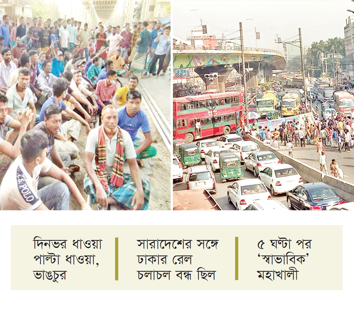সড়ক-রেললাইন আটকে বিক্ষোভকে কেন্দ্র করে আইনশৃঙ্খলা বাহিনীর সঙ্গে ব্যাটারিচালিত রিকশা চালকদের পাল্টাপাল্টি ধাওয়া-পাল্টা ধাওয়া ও আইনশৃঙ্খলা রক্ষাকারী বাহিনীর গাড়ি ভাঙচুরের পর অবশেষে সড়ক ছেড়েছেন বিক্ষোভকারীরা। মহাখালী এলাকার পরিস্থিতি ‘স্বাভাবিক হয়েছে’ জানিয়ে, বনানী থানার ওসি রাসেল সারোয়ার বলেছেন, গতকাল বৃহস্পতিবার বিকাল ৩টার পর এই এলাকার যান চলাচল শুরু হয়েছে। আরো এক ঘণ্টা পর ট্রেন চলাচল স্বাভাবিক হয় বলে কমলাপুরের স্টেশন মাস্টার মাহমুদুল হাসান জানান। পরিস্থিতি নিয়ন্ত্রণে রাখতে মহাখালী রেইলগেট এলাকায় বিপুল পরিমাণ সেনা ও পুলিশ সদস্য মোতায়েন রয়েছেন। ঢাকা মহানগরে ব্যাটারিচালিত রিকশা চলাচল বন্ধে উচ্চ আদালতের নির্দেশের প্রতিবাদে সকাল ৯টার পর থেকে মহাখালী রেইলগেট এলাকায় জমায়েত হতে থাকেন ব্যাটারিচালিত অটো রিকশাচালকরা। ১০টার দিকে চালকরা সড়কে নামলে এই এলাকায় রেলক্রসিংয়ের দুই দিকে যান চলাচলও বন্ধ হয়ে যায়।