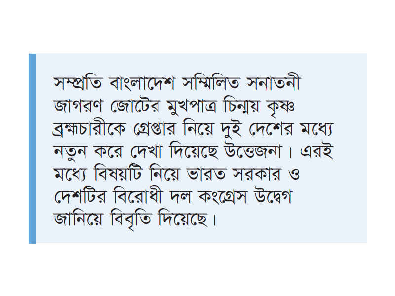 গত ২৫ নভেম্বর বিকেলে রাষ্ট্রদ্রোহসহ একাধিক মামলায় ঢাকা থেকে চট্টগ্রামে যাওয়ার সময় হযরত শাহজালাল আন্তর্জাতিক বিমানবন্দর থেকে ইসকনের সাবেক সংগঠক চিন্ময় কৃষ্ণ দাসকে গ্রেপ্তার করা হয়। পরে তার গ্রেপ্তার এবং জামিন নামঞ্জুরের ঘটনায় ২৬ নভেম্বর ভারত সরকারের পররাষ্ট্র মন্ত্রণালয় উদ্বেগ প্রকাশ করে। দেশটির পররাষ্ট্র মন্ত্রণালয়ের এক বিবৃতিতে বলা হয়, বাংলাদেশ সম্মিলিত সনাতনী জাগরণ জোটের মুখপাত্র চিন্ময় কৃষ্ণ দাসকে গ্রেপ্তার ও তাকে জামিন না দেওয়ার বিষয়টি নিয়ে আমরা গভীর উদ্বেগ প্রকাশ করছি। বাংলাদেশে সংখ্যালঘুর ওপর উগ্রবাদীদের একাধিক হামলার পর তাকে গ্রেপ্তারের ঘটনা ঘটল। বাংলাদেশে সংখ্যালঘুদের বাড়ি, ব্যবসা প্রতিষ্ঠানে লুটপাট ও অগ্নিসংযোগ; একই সঙ্গে মন্দিরে চুরি ও ভাঙচুরের ঘটনা ঘটেছে।