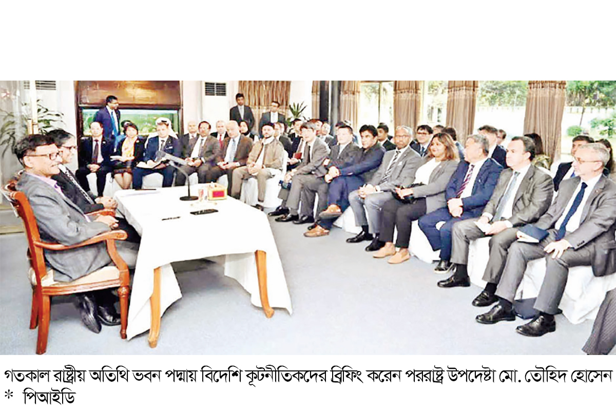 সীমান্তে ভারতীয় প্রতিবাদকারীরা বাংলাদেশের বর্ডারে ঢুকে যাওয়ার চেষ্টা করেছে, সেটিকে কিভাবে দেখেন- এমন প্রশ্নের উত্তরে উপদেষ্টা বলেন, এটাকে আমি একটা প্রভোকেশন হিসাবেই দেখি। প্রভোকেশন দেয়ার মতো লোকজন তো আছে, সেটা আমরা দেখতে পাচ্ছি। এটাকে প্রভোকেশন হিসেবে ততোক্ষণ দেখব যতোক্ষণ না তারা বর্ডার অতিক্রম করতে সক্ষম হয়। বিএসএফ তাদের সেখানে থামাতে সক্ষম হয়েছে। প্রোটেস্ট তারা করতেই পারেন, তাদের দেশের আইনও সেটাকে অ্যালাউ করে। তবে বর্ডার পার হওয়া মানে আইন ভঙ্গ করা। সেটা তারা ব্যবস্থা নিবেন। ধর্মীয় সংখ্যালঘু নির্যাতনের বিষয়ে অপপ্রচার নিয়ে ঢাকায় বিভিন্ন মিশনে দায়িত্বরত বিদেশি কূটনীতিকদের সরকারের অবস্থান ব্যাখ্যা করেন পররাষ্ট্র উপদেষ্টা মো. তৌহিদ হোসেন। ব্রিফিংয়ে যুক্তরাষ্ট্র, চীন, ভারত, জাপান, রাশিয়া, ইতালি, কানাডা, মরোক্কো, দ. কোরিয়া, ইউরোপীয় ইউনিয়ন, মিয়ানমার, আলজেরিয়া, ইরান, মালদ্বীপ, লিবিয়া, পাকিস্তান, সৌদি আরব, তুরস্ক, চীন, থাইল্যান্ড, অস্ট্রেলিয়া প্রভৃতি দেশের কূটনীতিকরা উপস্থিত ছিলেন।