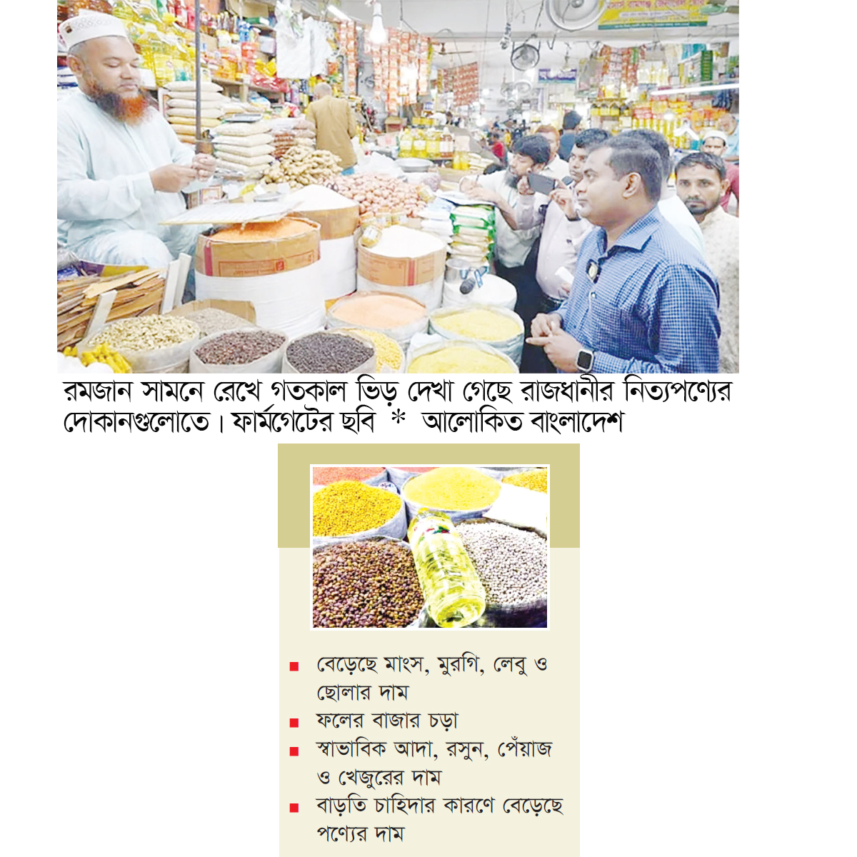 ব্যবসায়ীরা বলছেন, কাল থেকে রমজান মাস শুরু, আবার এখন মাসের শেষ সময়। এই দুই কারণে ভোক্তারা বেশি করে বাজার করছেন। বাড়তি চাহিদার কারণে কিছু পণ্যের দাম বেড়েছে। কারণ, চাহিদার তুলনায় পণ্যের সরবরাহ কম।