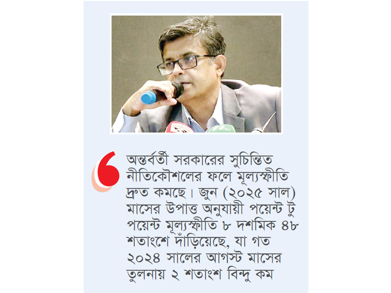 সোমবার দুপুরে প্রধান উপদেষ্টার প্রেস সচিব শফিকুল আলম ফেসবুক স্ট্যাটাসে লেখেন, অন্তর্বর্তী সরকারের সুচিন্তিত নীতিকৌশলের ফলে মূল্যস্ফীতি দ্রুত কমছে। জুন (২০২৫ সাল) মাসের উপাত্ত অনুযায়ী পয়েন্ট টু পয়েন্ট মূল্যস্ফীতি ৮ দশমিক ৪৮ শতাংশে দাঁড়িয়েছে, যা গত ২০২৪ সালের আগস্ট মাসের তুলনায় ২ শতাংশ বিন্দু কম।