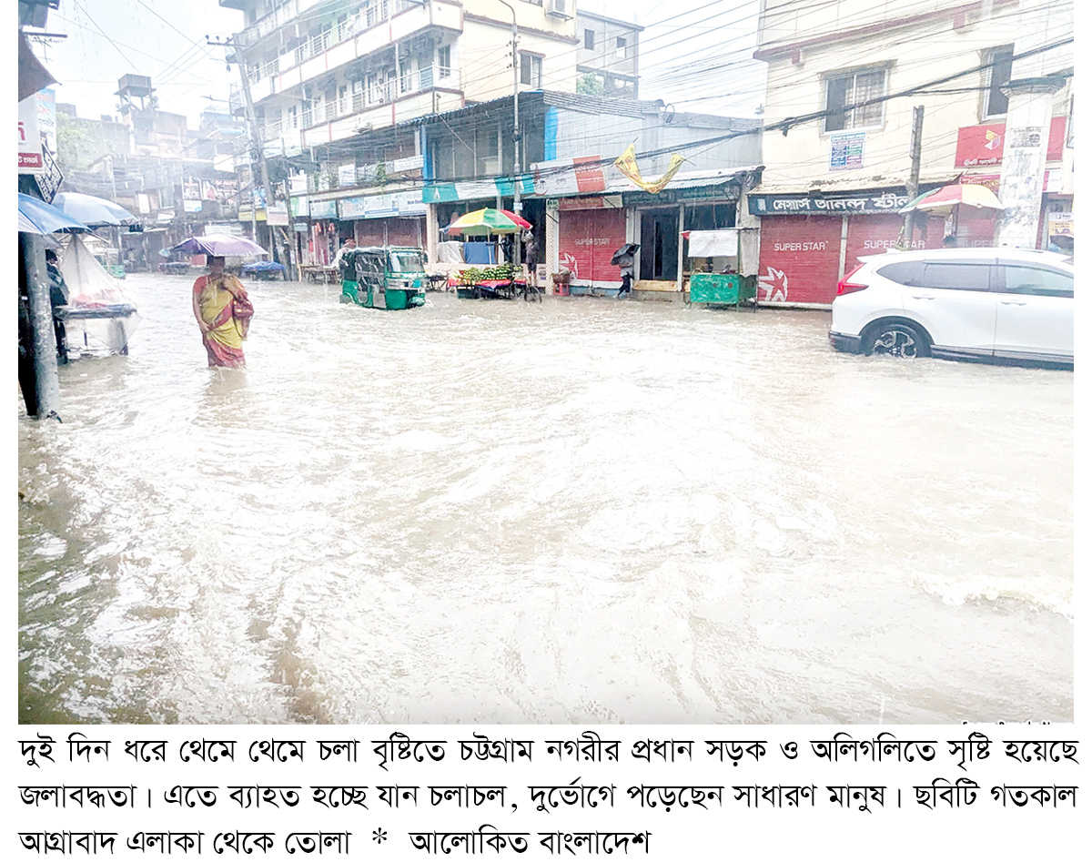 টানা বৃষ্টিতে নগরীর আগ্রাবাদ, জিইসি মোড়, চকবাজার, কাতালগঞ্জ, কেবি আনাম আলী রোড়, কাপাসগোলা, বাদুরতলা, রাহাত্তারপুল, বহদ্দারহাট এলাকায় কোথাও কোথাও সড়ক ও অলিগলির রাস্তা পানিতে ডুবে গেছে। এরপরও বৃষ্টির মধ্যে সকালে কর্মস্থল ও স্কুল-কলেজে যাওয়ার জন্য বের হয়ে অনেককেই ভোগান্তিতে পড়তে হয়েছে। বিশেষ করে বৃষ্টির কারণে সকালে গণপরিবহন কম থাকায় ভোগান্তি বেশি হয়েছে।