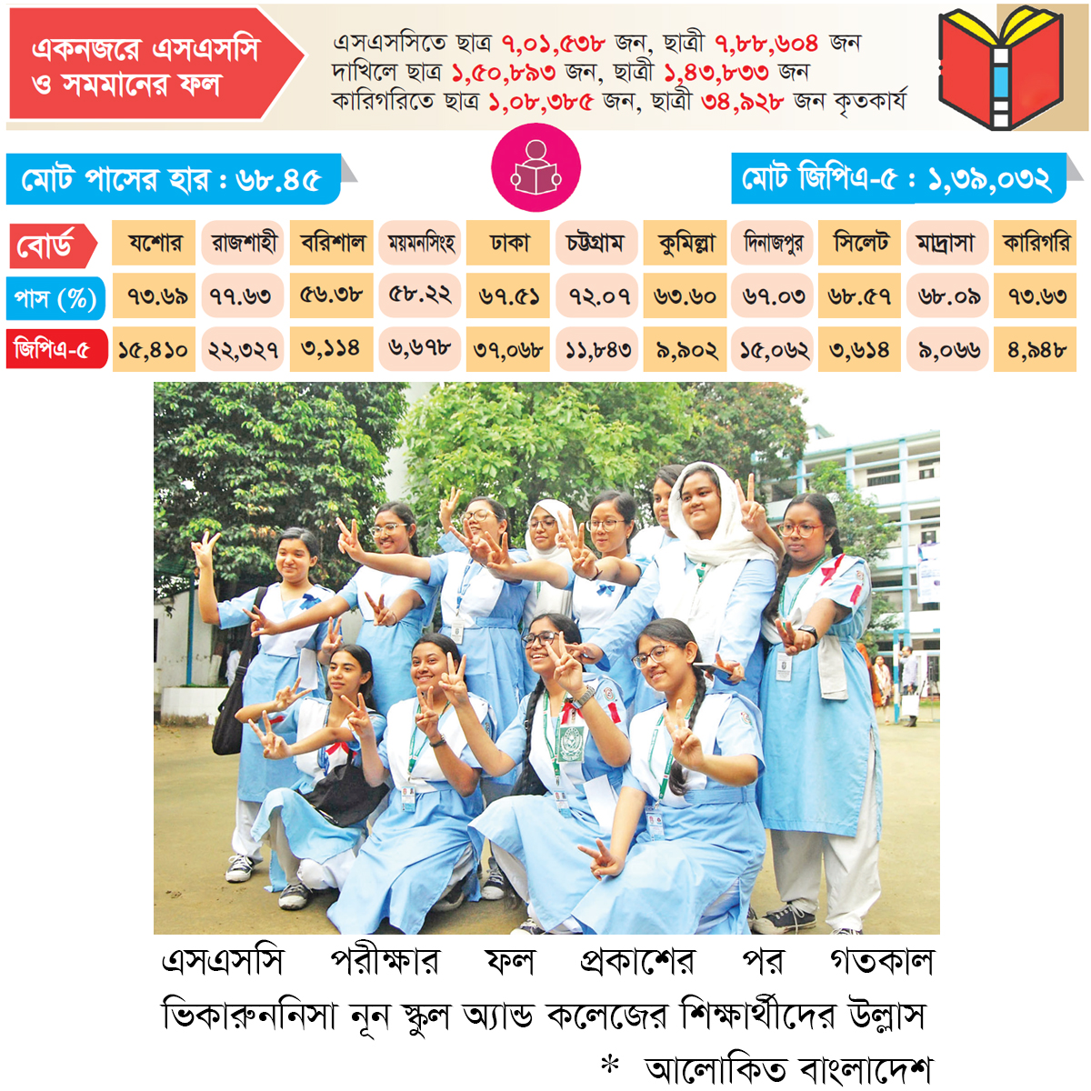 দেশের ১১টি শিক্ষা বোর্ডে এবার গড় পাসের হার ৬৮ দশমিক ৪৫ শতাংশ। ছাত্রদের পাসের হার ৬৫ দশমিক ৮৮ শতাংশ এবং ছাত্রীদের পাসের হার ৭১ দশমিক ০৩ শতাংশ। এবার মোট জিপিএ-৫ পেয়েছেন ১ লাখ ৩৯ হাজার ৩২ জন। তাদের মধ্যে ছাত্র ৬৫ হাজার ৪১৬ জন এবং ছাত্রী ৭৩ হাজার ৬১৬ জন। এবার ছাত্রীদের পাসের হার ৭১.০৩ শতাংশ এবং ছাত্রদের পাসের হার ৬৫.৮৮ শতাংশ। সেই হিসাবে এবারও পাসের হারে এগিয়ে রয়েছে ছাত্রীরা। এ নিয়ে টানা ১০ বছর এসএসসিতে পাসের হারে এগিয়ে ছাত্রীরা। বিগত ১১ বছরের এসএসসি ও সমমানের ফলাফল বিশ্লেষণে দেখা যায়, সবশেষ ২০১৫ সালে ছাত্রীদের চেয়ে পাসের হারে এগিয়ে ছিল ছাত্ররা। সে বছর ১১টি শিক্ষা বোর্ডে গড় পাসের হার ছিল ৮৭ দশমিক ০৪ শতাংশ। তার মধ্যে ছাত্রদের পাসের হার ছিল ৮৭ দশমিক ৪১ শতাংশ এবং ছাত্রীদের পাসের হার ছিল ৮৬ দশমিক ৬৪ শতাংশ। এরপর থেকে প্রতিবছর পাসের হারে এগিয়ে ছাত্রীরা।