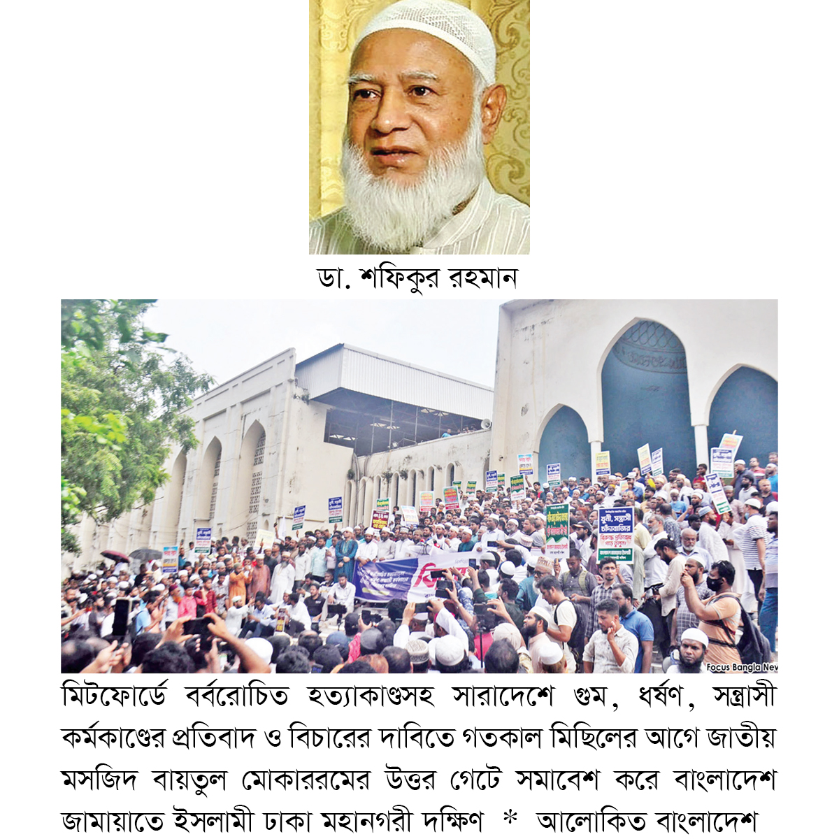 সন্ত্রাসী-চাঁদাবাজদের হাতে জামায়াত দেশ ছেড়ে দেবে না- রফিকুল ইসলাম: সন্ত্রাসী, চাঁদাবাজদের কাছে জামায়াতে ইসলামী দেশ ছেড়ে দেবে না বলে মন্তব্য করেছেন দলটির সহকারী সেক্রেটারি জেনারেল মাওলানা রফিকুল ইসলাম খান। তিনি বলেন, আওয়ামী ফ্যাসিবাদের পতনের পরও দেশে নতুন করে সন্ত্রাস ও চাঁদাবাজির আশঙ্কা তৈরি হয়েছে। জনগণকে সঙ্গে নিয়ে আমরা এদের প্রতিহত করবো। গতকাল দুপুরে বায়তুল মোকাররম জাতীয় মসজিদের উত্তর গেটে জামায়াতে ইসলামী ঢাকা মহানগরী দক্ষিণের উদ্যোগে আয়োজিত বিক্ষোভ মিছিল ও সমাবেশে তিনি এসব কথা বলেন। মিটফোর্ডে সম্প্রতি সংঘটিত বর্বরোচিত হত্যাকাণ্ডসহ সারাদেশে খুন, ধর্ষণ ও সন্ত্রাসের প্রতিবাদে এ কর্মসূচি পালিত হয়। রফিকুল ইসলাম খান বলেন, আওয়ামী লীগের পতনের পর মানুষ ভেবেছিল চাঁদাবাজি ও সন্ত্রাস থেকে মুক্তি মিলবে। কিন্তু দেখা গেলো, নতুন করে আরেকটি গোষ্ঠী সেই একই অপরাধে লিপ্ত হয়েছে। তারা নিজেদের নেতাকর্মীদের পর্যন্ত নৃশংসভাবে হত্যা করছে। অথচ তারা সন্ত্রাসের বিরুদ্ধে কিছু বলছে না, কারণ সন্ত্রাস-চাঁদাবাজ তারাই পোষে।