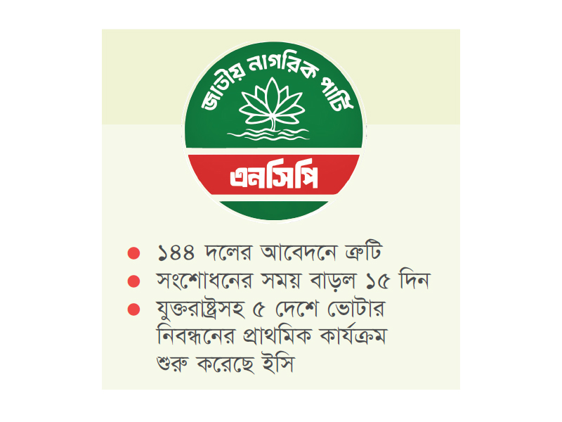 ইসির অতিরিক্ত সচিব বলেন, প্রাথমিক বাছাইয়ে জাতীয় নাগরিক পার্টিসহ (এনসিপি) নিবন্ধন চাওয়া নতুন ১৪৪টি দলের কাগজপত্রে ত্রুটি রয়েছে। তবে দলগুলোর অসম্পূর্ণ কাগজপত্র পূরণ করে ১৫ দিনের মধ্যে নির্বাচন কমিশনে জমা দিতে বলা হয়েছে।