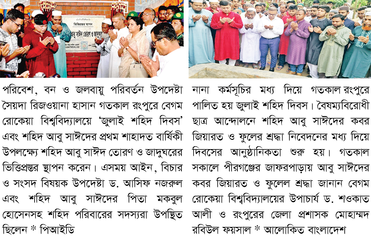 বিনম্র শ্রদ্ধা ও ভালোবাসায় সারা দেশে ‘জুলাই শহিদ দিবস’ পালিত হয়েছে। গত বছর এই দিন (১৬ জুলাই) বৈষম্যবিরোধী ছাত্র আন্দোলনে পুলিশের গুলিতে নিহত বেগম রোকেয়া বিশ্ববিদ্যালয়ের ইংরেজি বিভাগের শিক্ষার্থী আবু সাঈদের স্মরণে এই দিনটিকে রাষ্ট্রীয়ভাবে ‘জুলাই শহিদ দিবস’ ঘোষণা করা হয়। সে হিসেবে গতকাল বুধবার নানা কর্মসূচির মধ্য দিয়ে প্রথমবার দিবসটি পালন করা হয়। দিনের শুরুতে সকাল সাড়ে ৭টায় রংপুরের পীরগঞ্জের মদনখালী ইউনিয়নের জাফরপাড়া বাবনপুর গ্রামে শায়িত শহিদ আবু সাঈদের কবরে ফুল দিয়ে শ্রদ্ধা নিবেদন করা হয়। পরে তার রুহের মাগফিরাত কামনায় দোয়া মোনাজাত করা হয়। শ্রদ্ধা জানাতে উপস্থিত ছিলেন রংপুরের জেলা প্রশাসক মোহাম্মদ রবিউল ফয়সাল, বেগম রোকেয়া বিশ্ববিদ্যালয়ের উপাচার্য ড. শওকাত আলীসহ বিভিন্ন রাজনৈতিক, সামাজিক, সাংস্কৃতিক, পেশাজীবী ও ছাত্র সংগঠনের নেতৃবৃন্দ, বিশ্ববিদ্যালয়ের শিক্ষক ও শিক্ষার্থীরা। এসময় বিশ্ববিদ্যালয়ের উপাচার্য প্রফেসর ড. শওকাত আলী বলেন, আবু সাঈদের আত্মদানের বিষয়টি বিশ্ববিদ্যালয় কোনোদিন ভুলে যাবে না। তার স্মৃতি নিয়ে কাজ করছে তারা। একই সঙ্গে আবু সাঈদ হত্যার বিচার দ্রুত করতে বিশ্ববিদ্যালয় প্রশাসন সর্বদা সক্রিয় ভূমিকা রাখার কথাও জানান তিনি। দোয়া মোনাজাতের সময় কান্নায় ভেঙে পড়েন আবু সাঈদের বাবা মকবুল হোসেন। তিনি দাবি করেন, ছেলে হত্যার বিচার এবং আবু সাঈদের সম্মানার্থে দিবসের স্বীকৃতি। শহিদ আবু সাঈদের প্রথম শাহাদতবার্ষিকী উপলক্ষে বেগম রোকেয়া বিশ্ববিদ্যালয় প্রশাসনের উদ্যোগে দিনব্যাপী নানা কর্মসূচির আয়োজন করা হয়। দিবসটি উপলক্ষে গতকাল বুধবার সকাল সাড়ে ৯টায় বিশ্ববিদ্যালয় ক্যাম্পাসে কালো ব্যাজ ধারণ করে একটি শোক র্যালি অনুষ্ঠিত হয়। সকাল সাড়ে ১০টায় উদ্বোধন করা হয় আবু সাঈদ তোরণ ও মিউজিয়ামের ভিত্তিপ্রস্তর এবং তার নিহত হওয়ার স্থানে ‘আবু সাঈদ চত্বর’ ঘোষণার মাধ্যমে একটি স্মৃতিস্তম্ভ স্থাপনের কাজ শুরু করা হয়। বেলা ১১টায় শুরু হয় আলোচনা সভা। এতে অংশ নেন অন্তর্বর্তী সরকারের আইন, বিচার ও সংসদবিষয়ক এবং প্রবাসী কল্যাণ ও বৈদেশিক কর্মসংস্থান মন্ত্রণালয়ের উপদেষ্টা প্রফেসর ড. আসিফ নজরুল এবং পানিসম্পদ ও পরিবেশ, বন ও জলবায়ু পরিবর্তন মন্ত্রণালয়ের উপদেষ্টা সৈয়দা রিজওয়ানা হাসান। বিকাল সাড়ে ৩টায় চিত্রাঙ্কন প্রতিযোগিতা এবং বাদ আসর বিশ্ববিদ্যালয়ের কেন্দ্রীয় মসজিদে মিলাদ ও দোয়া মাহফিল অনুষ্ঠিত হয়।