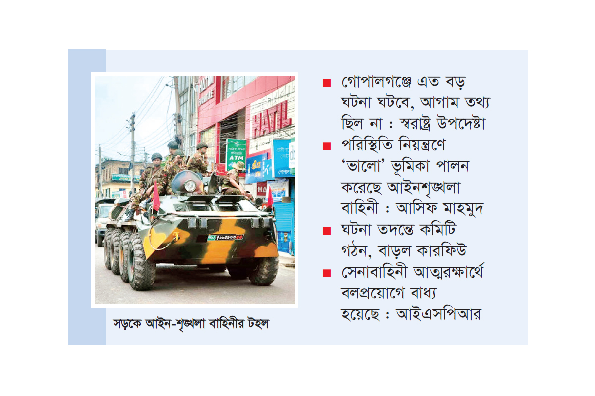 একপর্যায়ে সেনাবাহিনী আত্মরক্ষার্থে বল প্রয়োগে বাধ্য হয়। পরবর্তী সময়ে, সেনাবাহিনী, বিজিবি ও পুলিশ যৌথভাবে বিশৃঙ্খলাকারীদের ছত্রভঙ্গ করে দেয়। পরে সেনাবাহিনীর সার্বিক তত্ত্বাবধানে গোপালগঞ্জের পুলিশ সুপারের কার্যালয়ে আশ্রয় নেওয়া ব্যক্তিদের খুলনায় স্থানান্তর করা হয়। সর্বোপরি, আইনশৃঙ্খলা বাহিনী পেশাদারত্ব ও ধৈর্যের সঙ্গে জননিরাপত্তা নিশ্চিত করে পরিস্থিতি নিয়ন্ত্রণে আনতে সক্ষম হয়।’ বর্তমানে গোপালগঞ্জ জেলায় সার্বিক নিরাপত্তা পরিস্থিতি স্বাভাবিক এবং প্রশাসনের জারি করা কারফিউ চলমান রয়েছে উল্লেখ করে সেনাবাহিনী বলছে, সেনাবাহিনী, বিজিবি, পুলিশ, র্যাব এবং প্রশাসনের অন্যান্য সংস্থা ঘনিষ্ঠভাবে সমন্বয় রেখে কাজ করে যাচ্ছে। বুধবার সকাল থেকে চলমান এই রাজনৈতিক সহিংসতা ও বিশৃঙ্খলায় গোপালগঞ্জ জেলার জনসাধারণ অত্যন্ত ধৈর্যের সঙ্গে নিজেদের নিবৃত্ত রেখে সেনাবাহিনীকে সহায়তা করেছেন। গুজব বা অপপ্রচারে বিভ্রান্ত না হয়ে ধৈর্য ধারণ এবং আইনশৃঙ্খলা বাহিনীকে সহযোগিতা করার জন্য সর্বসাধারণকে বিশেষভাবে অনুরোধ করা হলো। বাংলাদেশ সেনাবাহিনী দেশের সার্বভৌমত্ব ও জননিরাপত্তা রক্ষায় সর্বদা প্রতিশ্রুতিবদ্ধ।