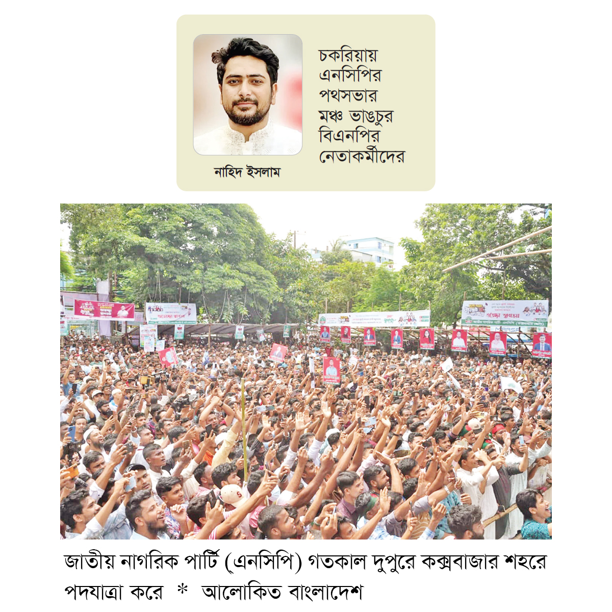 চকরিয়ায় এনসিপির পথসভার মঞ্চ ভাঙচুর বিএনপির নেতাকর্মীদের : কক্সবাজারের চকরিয়া পৌর শহরের জনতা শপিং সেন্টার চত্বরে করা জাতীয় নাগরিক পার্টির (এনসিপি) পথসভা মঞ্চ ভেঙে দিয়েছেন বিএনপি ও ছাত্রদলের নেতাকর্মীরা। ট্রাকের ওপর মঞ্চটি করা হয়েছিল। গতকাল শনিবার বিকাল পৌনে ৪টার দিকে এ ঘটনা ঘটে। পরে সেনাবাহিনী ও পুলিশ গিয়ে তাদের ছত্রভঙ্গ করে।
