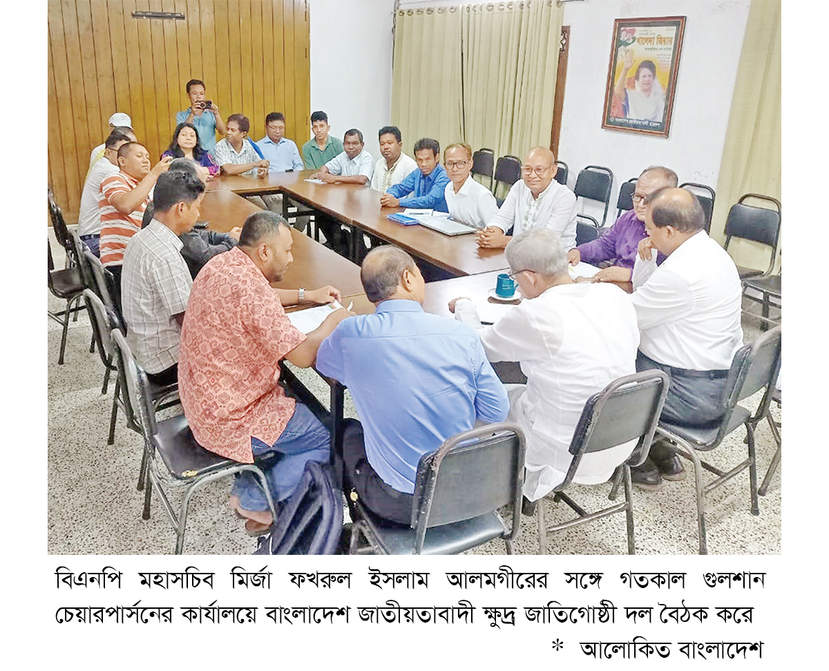 গুলশানে চেয়ারপারসনের কার্যালয়ে জাতীয়তাবাদী ক্ষুদ্র জাতিগোষ্ঠী দলের নেতাদের সঙ্গে বিএনপি মহাসচিবের এ বৈঠক হয়। আগামী ৩০ আগস্ট ময়মনসিংহে ক্ষুদ্র জাতিগোষ্ঠীর সমাবেশ উপলক্ষে বৈঠকটি অনুষ্ঠিত হয়। বৈঠকে জাতীয়তাবাদী ক্ষুদ্র জাতিগোষ্ঠী দলের সভাপতি মৃগেন হাগিদের নেতৃত্বে ২০ জন নেতা উপস্থিত ছিলেন। এই বৈঠকে দলের চেয়ারপারসনের উপদেষ্টা কাউন্সিলের সদস্য হিন্দু বৌদ্ধ খ্রিষ্টান কল্যাণ ফ্রন্টের চেয়ারম্যান বিজন কান্তি সরকার উপস্থিত ছিলেন। জাতীয়তাবাদী ক্ষুদ্র জাতিগোষ্ঠী দল ২০০৭ সালে ১৮ ডিসেম্বর যাত্রা শুরু করে। বৈঠকের পরে বিএনপি মহাসচিব সাংবাদিকদের সঙ্গে কথা বলেন। তিনি বলেন, ‘প্রধান উপদেষ্টা রাজনৈতিক দলগুলোকে ডেকেছিলেন। আমরা আলোচনা করেছি, আমরা পূর্বের যে কমিটমেন্ট টু কোঅপারেট উইথ দ্য ইন্টেরিম গভর্মেন্ট, তাদের সর্বাত্মক সহযোগিতা করার কথা আমরা বলে এসেছি। একইসঙ্গে নির্বাচন প্রক্রিয়াকে দ্রুত করা, ত্বরান্বিত করা এবং ওনার (প্রধান উপদেষ্টা) যে প্রতিশ্রুতি ফেব্রুয়ারি মাসের মাঝামাঝি সময়ের মধ্যে নির্বাচন দেওয়া হবে- আমরা মনে করি অতি দ্রুত সেই ব্যবস্থা গ্রহণ করা উচিত।’
