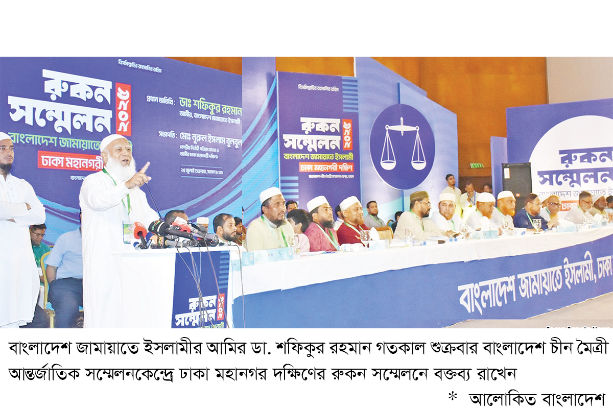 বাংলাদেশ জামায়াতে ইসলামী ক্ষমতায় গেলে দলের মতো দেশও নিয়ন্ত্রণ করতে পারবে বলে দাবি করেছেন দলটির আমির ডা. শফিকুর রহমান। তার ভাষায়, ‘দলকে যেভাবে নিয়ন্ত্রণ করতে পারি, তেমনিভাবে দেশও নিয়ন্ত্রণ করতে পারব।’ গতকাল শুক্রবার বিকেলে রাজধানীর চীন মৈত্রী সম্মেলন কেন্দ্রে আয়োজিত ঢাকা মহানগর দক্ষিণের রুকন সম্মেলনে প্রধান অতিথির বক্তব্যে তিনি এসব বলেন। এসময় জামায়াত আমির আরও দাবি করেন, ‘জামায়াতে ইসলামীর কোনো নেতার বেগমপাড়া কিংবা পিসি পাড়া নেই। আমাদের কেউ পালায়নি, পালাবেও না।’ শফিকুর রহমান বলেন, ‘দেশের প্রতি দায়বদ্ধতা থেকেই জামায়াত নেতারা সংকটের সময় পালিয়ে না গিয়ে বরং দেশে ফিরে এসে জনগণের পাশে দাঁড়িয়েছেন। দেশত্যাগ করে বিদেশে দ্বিতীয় ঠিকানা বানানোর মতো কোনো নেতা জামায়াতে নেই।’ তিনি বলেন, ‘যারা দেশকে ভালোবাসে না, তারাই ব্যক্তিস্বার্থে বেগমপাড়া বানিয়ে সরে পড়েছে। অন্যদিকে জামায়াতের নেতাকর্মীরা দেশের স্বাধীনতা, সার্বভৌমত্ব ও জনগণের অধিকার রক্ষার সংগ্রামে নেতৃত্ব দিয়ে রাজনৈতিক প্রতিহিংসার শিকার হয়েছেন। তাদের বিচারিক হত্যাও ঘটেছে।’ বিগত ৫৪ বছরে জামায়াত কোনো নাগরিকের প্রতি অবিচার করেনি দাবি করে শফিকুর রহমান বলেন, ‘জামায়াতের কোনো নেতাকর্মী চাঁদাবাজি বা সন্ত্রাসী কর্মকাণ্ডে জড়িত নয়। থাকবেও না। আমরা দল পরিচালনায় যেমন শৃঙ্খলাবদ্ধ, তেমনিভাবে রাষ্ট্র পরিচালনাও করতে পারব। যারা নিজেদের দলই নিয়ন্ত্রণ করতে পারে না, তারা দেশেরও নিয়ন্ত্রণে ব্যর্থ হবে।’ ইসলামকে পৃথিবীর একমাত্র অসাম্প্রদায়িক ধর্ম উল্লেখ করে জামায়াত আমির বলেন, ‘ইসলামী রাষ্ট্র প্রতিষ্ঠিত হলে চাঁদাবাজ, সন্ত্রাসী, মাদক ব্যবসায়ী, ধর্ষক, খুনি ও লুটেরাদের ভয় থাকবে। এজন্যই তারা আমাদের বিরুদ্ধে অপপ্রচার চালায়। কিন্তু ইসলামী রাষ্ট্র মানে নারীদের চলাচলের ওপর কোনো বিধিনিষেধ নয়।’ তিনি প্রশ্ন তোলেন, ‘যেখানে ইসলামী আন্দোলনের সঙ্গে যুক্ত পরিবারের মা-বোনেরা বাজারে যেতে পারেন, হাসপাতালে যেতে পারেন, মৌলিক প্রয়োজন মেটাতে পারেন, সেখানে ইসলামী রাষ্ট্র প্রতিষ্ঠা হলে কেন নারীদের স্বাধীনতায় বাধা আসবে?’ তার ভাষায়, ‘রাষ্ট্র কোনো ধর্ম বা লিঙ্গভেদ করতে পারে না। ইসলামিক রাষ্ট্রব্যবস্থায় নারী-পুরুষ, মুসলিমণ্ডঅমুসলিম সব নাগরিক সমান মর্যাদার অধিকারী হবে। জামায়াত একটি ইনসাফভিত্তিক সমাজ গঠনের পথে চলতে চায়, যেখানে থাকবে না বৈষম্য বা জুলুম।‘ অনুষ্ঠানে সভাপতিত্ব করেন জামায়াতের কেন্দ্রীয় নির্বাহী পরিষদ সদস্য ও ঢাকা মহানগর দক্ষিণের আমির নূরুল ইসলাম বুলবুল। বিশেষ অতিথি হিসেবে বক্তব্য দেন দলের সেক্রেটারি জেনারেল ও সাবেক সংসদ সদস্য অধ্যাপক মিয়া গোলাম পরওয়া
