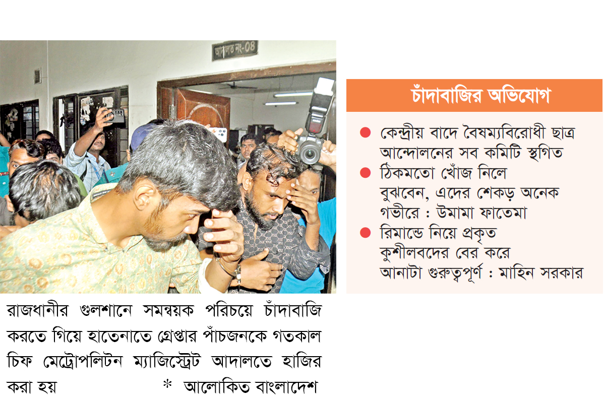 এদিকে, চাঁদাবাজির মামলায় বৈষম্যবিরোধী ছাত্র আন্দোলনের চার নেতার সাত দিনের রিমান্ড মঞ্জুর করেছেন আদালত। গতকাল রোববার ঢাকার অতিরিক্ত চিফ মেট্রোপলিটন ম্যাজিস্ট্রেট মো. জিয়াদুর রহমান শুনানি শেষে এ আদেশ দেন। রাজধানীর গুলশানে আওয়ামী লীগের সাবেক সংসদ সদস্য শাম্মী আহমেদের বাসায় গিয়ে ৫০ লাখ টাকা চাঁদা দাবির অভিযোগে করা মামলায় তাদের রিমান্ডে পাঠানো হলো। আসামিরা হলেন- বৈষম্যবিরোধী ছাত্র আন্দোলনের ঢাকা মহানগরের আহ্বায়ক ইব্রাহিম হোসেন মুন্না, সদস্য মো. সাকাদাউন সিয়াম, সাদাব ও আব্দুর রাজ্জাক রিয়াদ। এদিন মামলার তদন্তকারী কর্মকর্তা গুলশান থানার পুলিশ পরিদর্শক মোখলেসুর রহমান আসামিদের ১০ দিনের রিমান্ড চেয়ে আবেদন করেন। রিমান্ড মঞ্জুরের পক্ষে শুনানি করেন রাষ্ট্রপক্ষের অতিরিক্ত পাবলিক প্রসিকিউটর শামসুদ্দোহা সুমন।