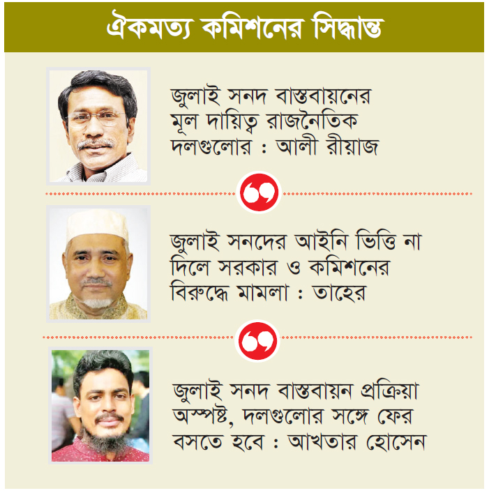 অন্যদিকে জুলাই সনদের খসড়া তৈরি করে রাজনৈতিক দলগুলোর কাছে পাঠিয়েছে জাতীয় ঐকমত্য কমিশন। তবে সেই খসড়া সনদ নিয়ে রাজনৈতিক দলগুলোর ভেতরে মতানৈক্য দেখা দিয়েছে। গতকাল বৃহস্পতিবার রাজনৈতিক দলগুলোর সঙ্গে সংলাপের শুরুতে অধ্যাপক আলী রীয়াজ বলেছেন, ‘জুলাই সনদ বাস্তবায়নের মূল দায়িত্ব রাজনৈতিক নেতাদের। আমরা বিশ্বাস করি, যেসব বিষয়ে আপনারা একমত হয়েছেন, সেগুলো বাস্তবায়নের পথ আপনারা তৈরি করতে পারবেন। সেখানে কমিশন আনুষ্ঠানিক এবং অনানুষ্ঠানিকভাবে অনুঘটকের কাজ করবে। প্রয়োজনে সনদের বাস্তবায়ন কাঠামো নির্ধারণে রাজনৈতিক দলগুলোর সঙ্গে আবারও বসবে এনসিসি।’