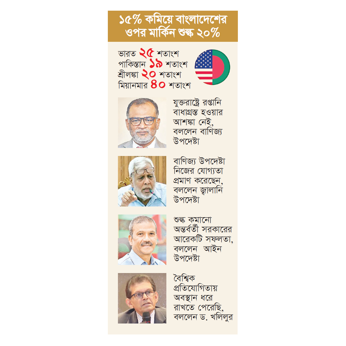 অন্তর্বর্তী সরকারের বাণিজ্য উপদেষ্টার নেতৃত্বে মার্কিন প্রশাসনের সঙ্গে কয়েক দফা বৈঠক হয়। বৈঠকে বাণিজ্য উপদেষ্টা শেখ বশিরউদ্দীন নিজের যোগ্যতা প্রমাণ করেছেন বলে মন্তব্য করেছেন অন্তর্বর্তী সরকারের বিদ্যুৎ, জ্বালানি ও খনিজসম্পদ উপদেষ্টা মুহাম্মদ ফাওজুল কবির খান। সামাজিক যোগাযোগমাধ্যম ফেসবুকে এক পোস্টে উপদেষ্টা মুহাম্মদ ফাওজুল কবির খান বলেছেন, ‘দেশের অভ্যন্তরীণ পণ্যমূল্য স্থিতিশীলতা বজায় রাখা থেকে শুরু করে যুক্তরাষ্ট্রের সঙ্গে সফল শুল্ক আলোচনায় তিনি (বাণিজ্য উপদেষ্টা) নিজের যোগ্যতা প্রমাণ করেছেন, সমালোচকদের হতাশ করে।’ ২০ শতাংশ শুল্ক আরোপের বিষয়টিকে বর্তমান অন্তর্বর্তী সরকারের অন্যতম সফলতা হিসেবে দেখছেন আইন উপদেষ্টা ড. আসিফ নজরুল। গতকাল নিজের ভেরিফায়েড ফেসবুক পেজে দেওয়া এক পোস্টে আসিফ নজরুল লেখেন, ‘১৫ শতাংশ কমিয়ে বাংলাদেশের ওপর যুক্তরাষ্ট্রের শুল্ক ২০ শতাংশ। অ্যানাদার সাকসেস অব ইন্টেরিম গভর্নমেন্ট’।