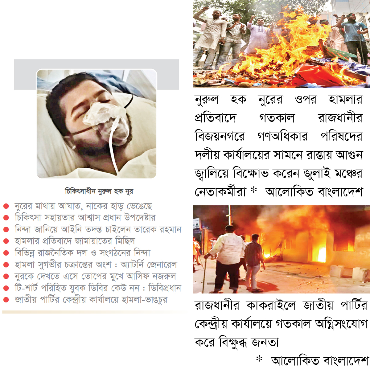 জামায়াতের বিক্ষোভ মিছিল : গণঅধিকার পরিষদের সভাপতি নুরুল হক নুরসহ দলীয় নেতাকর্মীদের ওপর হামলার প্রতিবাদে গতকাল শনিবার রাজধানীতে বিক্ষোভ মিছিল ও সমাবেশ করেছে বাংলাদেশ জামায়াতে ইসলামী ঢাকা মহানগরী দক্ষিণ। রাজধানীর বায়তুল মোকাররম উত্তর গেইটে এ কর্মসূচি পালন করা হয়। বাংলাদেশ জামায়াতে ইসলামীর কেন্দ্রীয় কর্মপরিষদ সদস্য ও ঢাকা মহানগরী দক্ষিণের নায়েবে আমীর এডভোকেট ড. হেলাল উদ্দিনের সভাপতিত্বে মিছিল-পূর্ব সমাবেশ অনুষ্ঠিত হয়। এতে প্রধান অতিথি হিসেবে উপস্থিত ছিলেন দলটির সহকারী সেক্রেটারি জেনারেল ও সাবেক এমপি ড. এএইচএম হামিদুর রহমান আযাদ। বিশেষ অতিথি হিসেবে উপস্থিত ছিলেন সহকারী সেক্রেটারি জেনারেল মাওলানা আব্দুল হালিম। সমাবেশ শেষে বায়তুল মোকাররম থেকে একটি বিশাল বিক্ষোভ মিছিল বের হয়ে মৎস্যভবন মোড়ে গিয়ে সমাবেশ শেষ হয়। সমাবেশে কেন্দ্রীয় ও মহানগরীর বিভিন্ন পর্যায়ের নেতাকর্মীরা অংশ নেন।